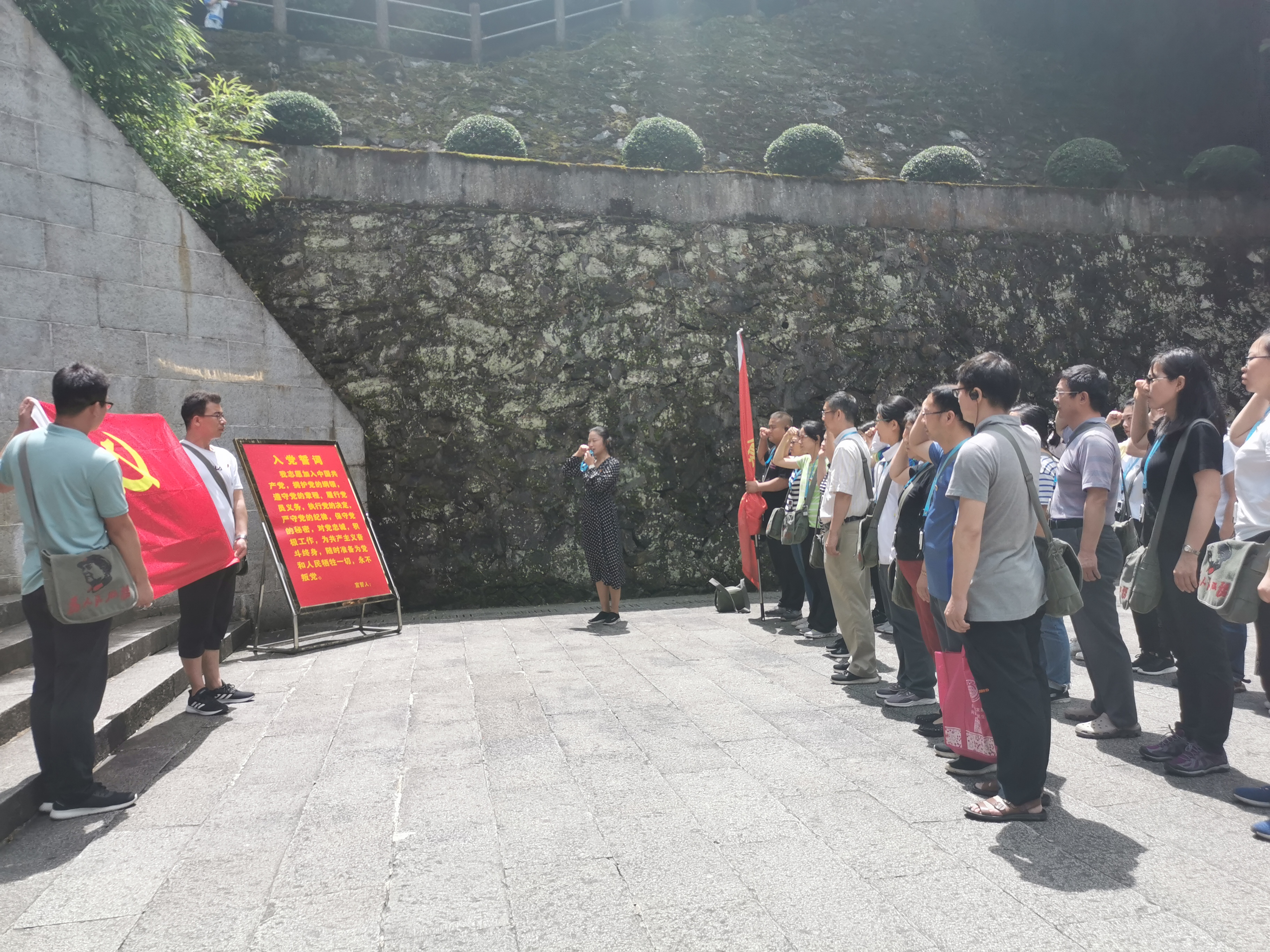 在井冈山革命烈士陵园,邓小平同志题写的“井冈山革命烈士纪念碑”提示这里是庄严的革命圣地。在这里,在罗纹石上,是党和国家领导人、参加过井冈山斗争的老红军、著名书法家、画家、作家和知名人士的题词,他们热情讴歌了井冈山革命斗争的光辉历史和英雄业绩。全体党员教师聆听了声情并茂的讲解,一个个鲜活的革命党人丰功伟绩,深深打动人心。之后,全体党员向烈士敬献花圈并重温入党誓词。