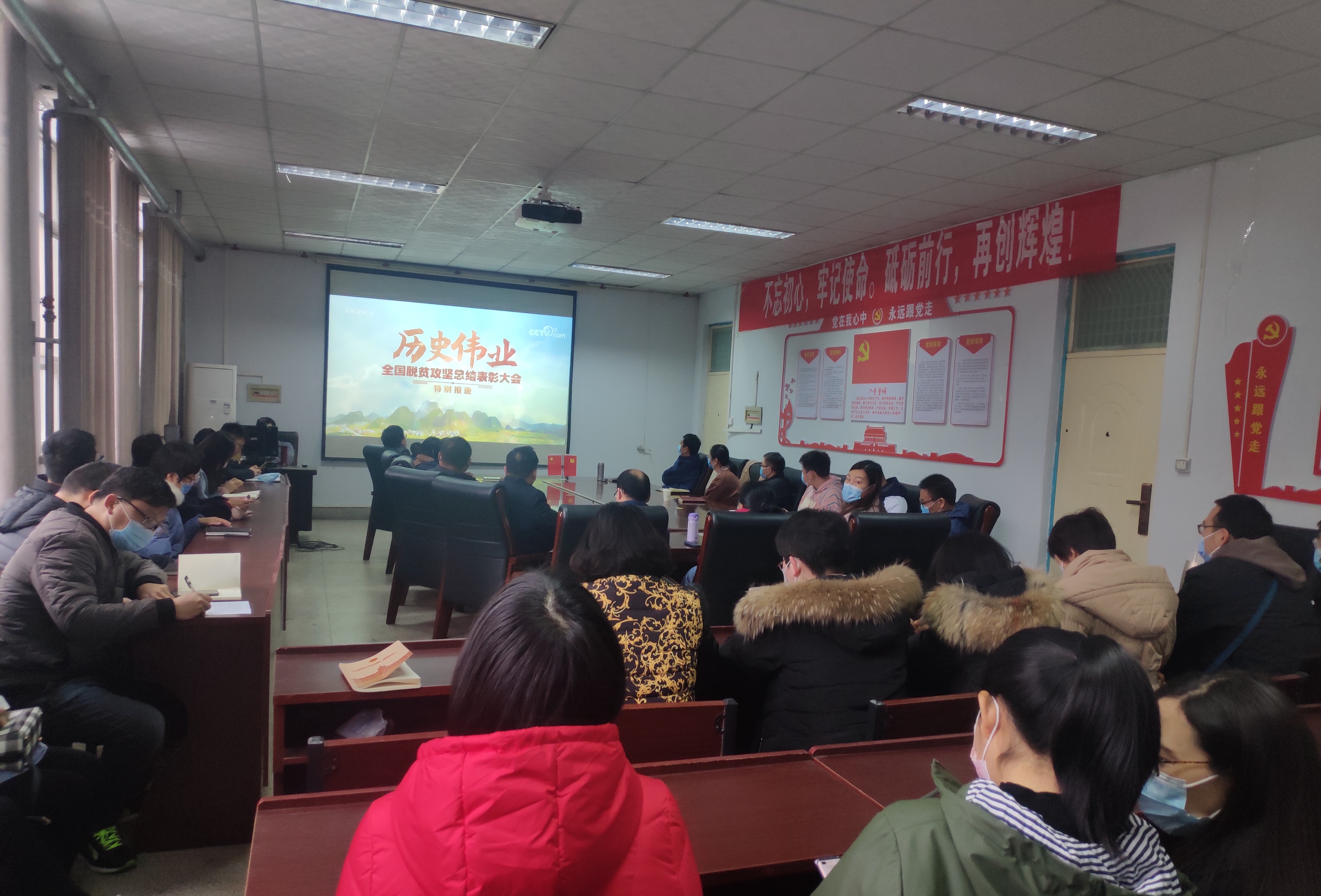 亚洲色吧 组织教职工党员、学生党员收看了全国脱贫攻坚总结表彰大会。教职工党员在17号楼报告厅统一集中观看网络直播,学生党员在网上观看。