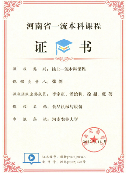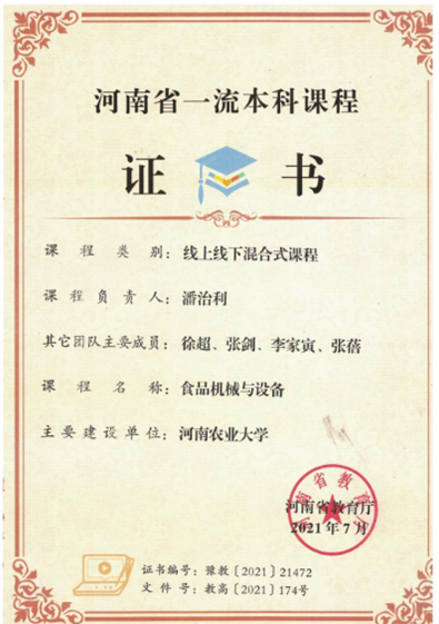 《食品机械与设备》是食品科学与工程类专业的核心课程,在本校开课于1989年,已经有30多年的历史。经过多年的建设,2011年被评为“校级优秀课程”,建设了内容丰富充实的课程网站,开始信息化教学;2017~2018年,由于课程改革的突出成绩,课程被评为“校级核心示范课程”,本课程团队被评为“校级优秀基层教学组织”;2019年,被评为“河南省精品在线开放课程”,在2020年全省的在线课程评价时,被评价“优秀”等级。