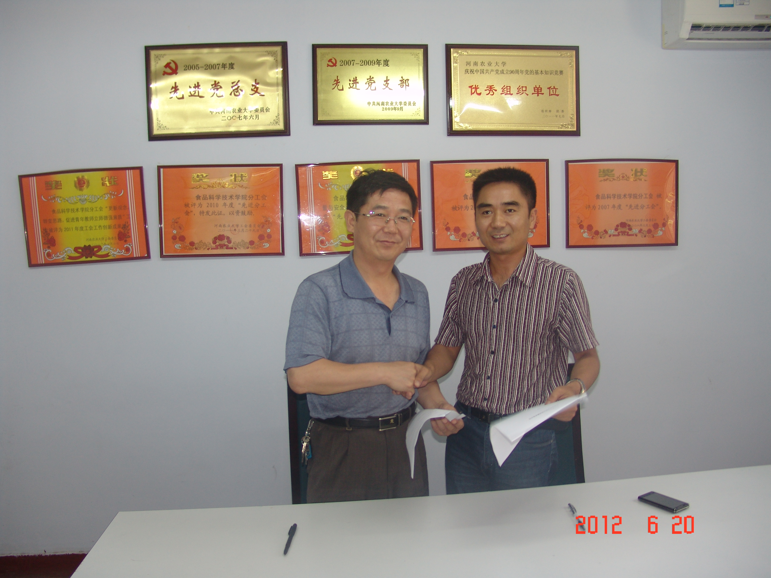 赵改名院长代表食品学院与王民杰总经理签订了奖学金设立协议。王民杰表示,设立此学金既是向学校的百岁华诞献礼,也是表达对母校培养的感激之情,更希望师弟师妹们能够热爱学习,立足专业,奋发向上,自强不息。今后,在可能的情况下,他们会追加捐款金额,并在学院教师中设立奖励基金,为学校学院发展做出更大的贡献。