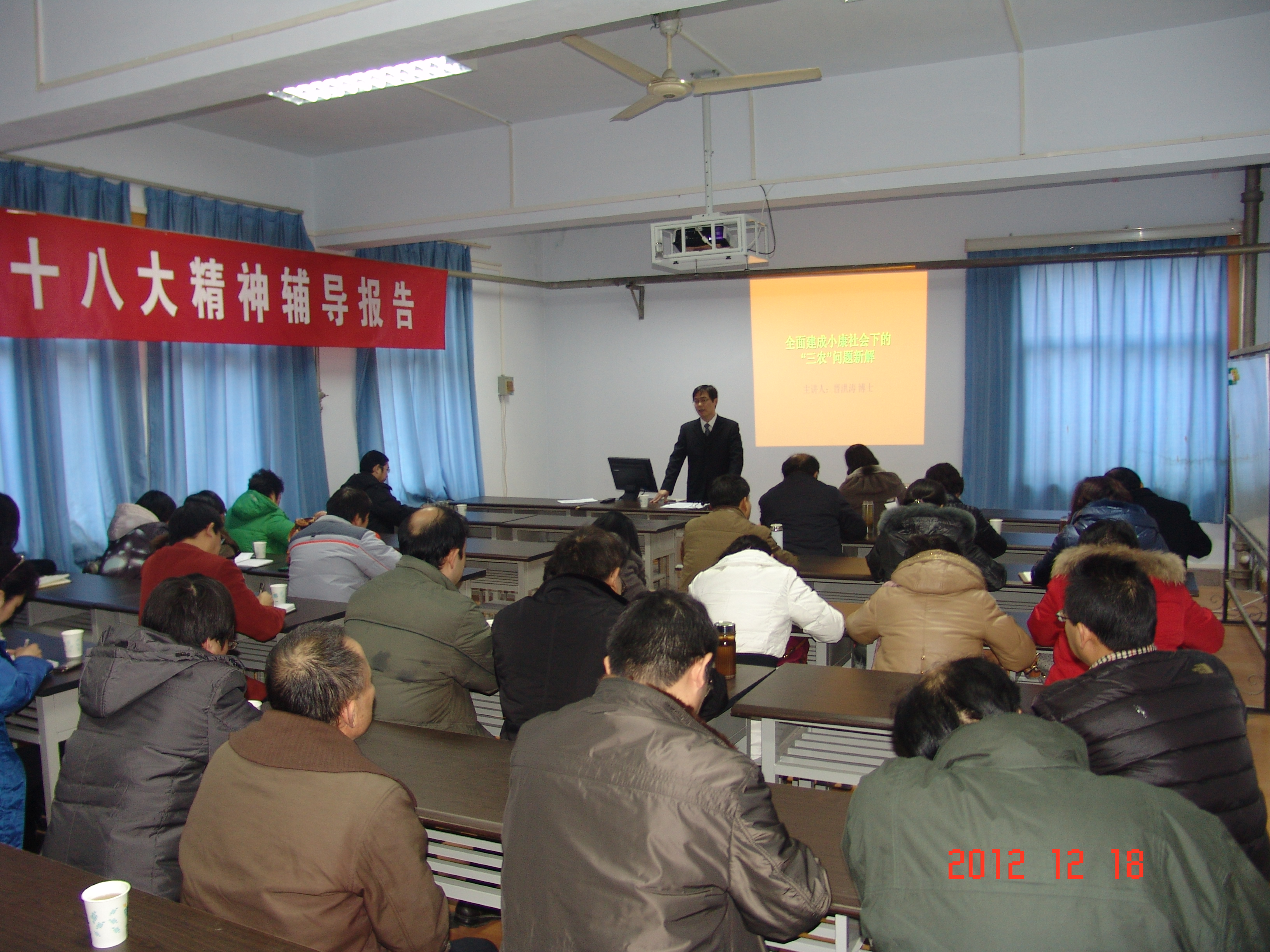 晋洪涛博士代表校宣讲团对党的十八大的新思想、新观点、新要求作了详细的阐释,尤其是与我校结合紧密的“三农”问题,特别提出“三农”问题是全面建成小康社会的重点和难点。晋洪涛博士指出作为亚洲色吧 的一分子,我们有责任与义务承担起振兴农业、发展农业的重任,我们应该把知识扎根于农业、农村、农民,进一步领悟党的十八大会议精神,全心全意为人民服务。