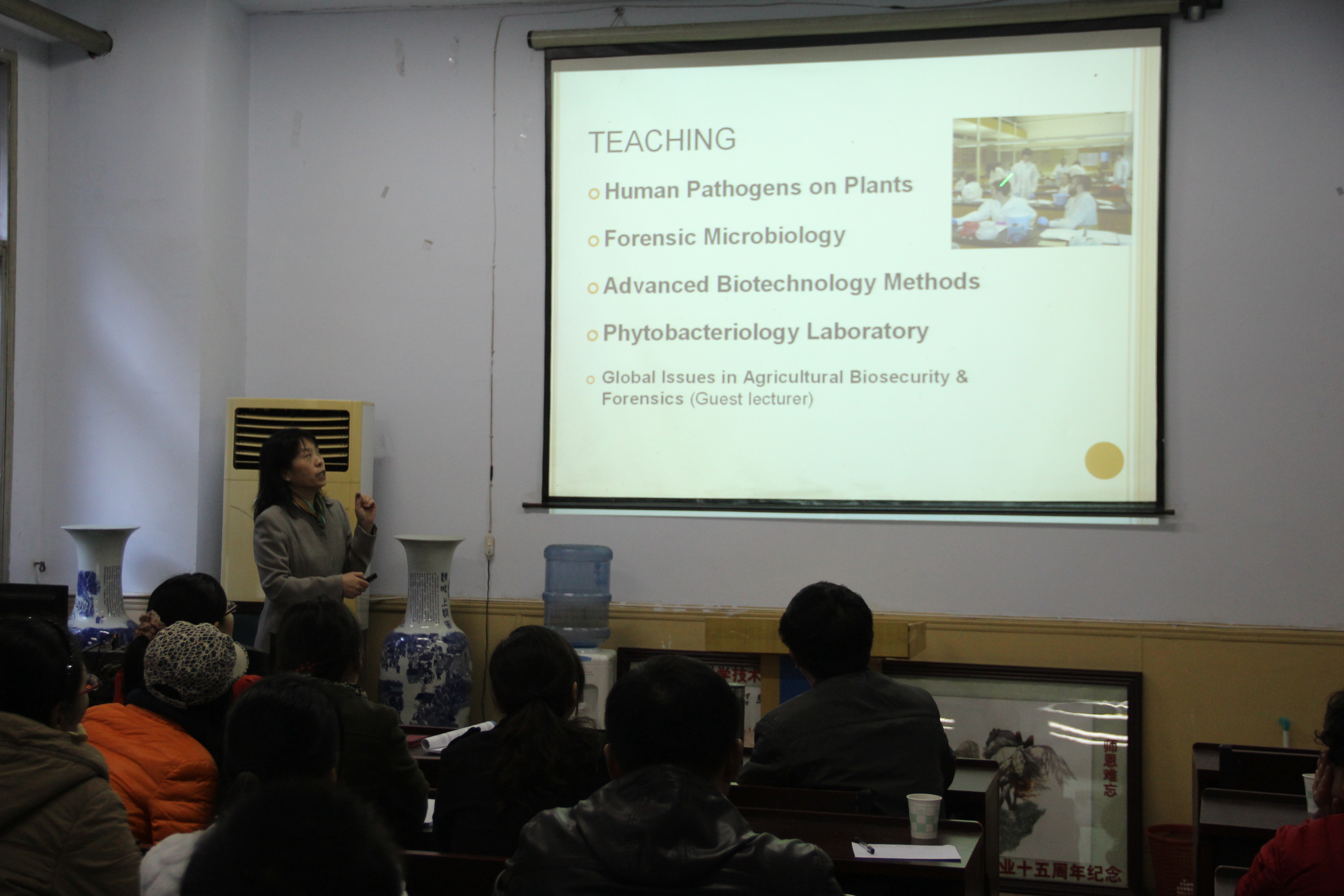 在本次报告座谈会中,Li Maira Ma博士首先向我们介绍了她所在的oklahoma州立大学的历史与发展状况,同时向我们展示了她所在实验室工作的相关图片资料,并进行了生动而详细地介绍和讲解。最后,她向大家讲解她所在科研团队在果蔬食源性致病菌研究方向上的研究进展和研究成果。
