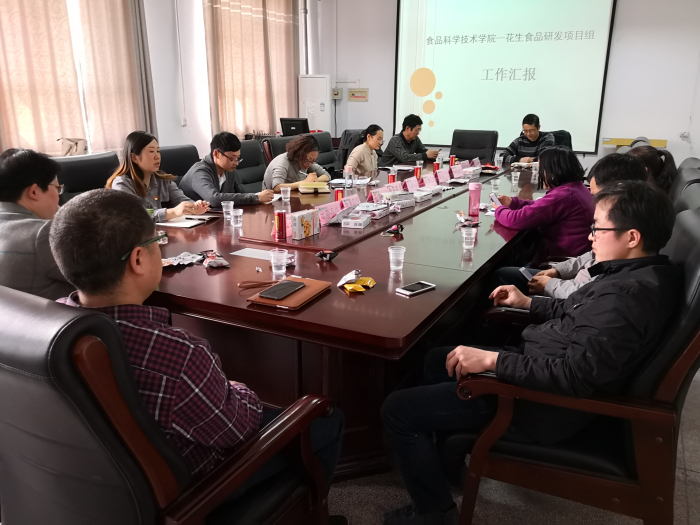 花生食品研发项目是学院首次以校企合作创新项目形式开展的研究项目。学院高度重视,精心组织,与合作企业正阳新地花生集团紧密配合,在短短的一年时间里就建起了花生休闲食品和花生饮料两条生产线,研发新产品20余个。会上,项目组成员宋晓燕、詹丽娟、赵秋艳和张建威等老师分享了一年来的工作经验和收获。