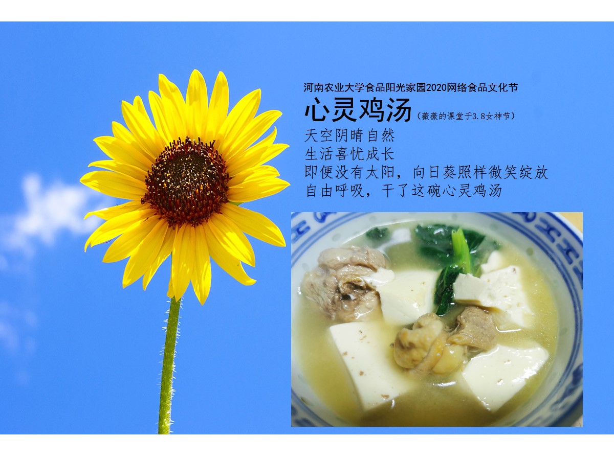 煎、炸、烹、炒、蒸......一道道美味的菜肴种类繁多、让人应接不暇。食品学院师生来自五湖四海,不同地域,美食也各有特色,但凝结在作品中的爱是相通的,食物展现出来的中华饮食文化是可以引起共鸣的。魏玮老师的“心灵鸡汤”鼓励学生像向日葵一样微笑迎接成长;李宁老师的彩虹面点寓意中国抗“疫”胜利,雨过天晴!黄昊龙同学的红烧排骨,祝福祖国“排”除万难,“骨”足勇气,攻克疫情难关!从手到口,从口到心,食品学院师生用美味佳肴为祖国祝福,为武汉加油!