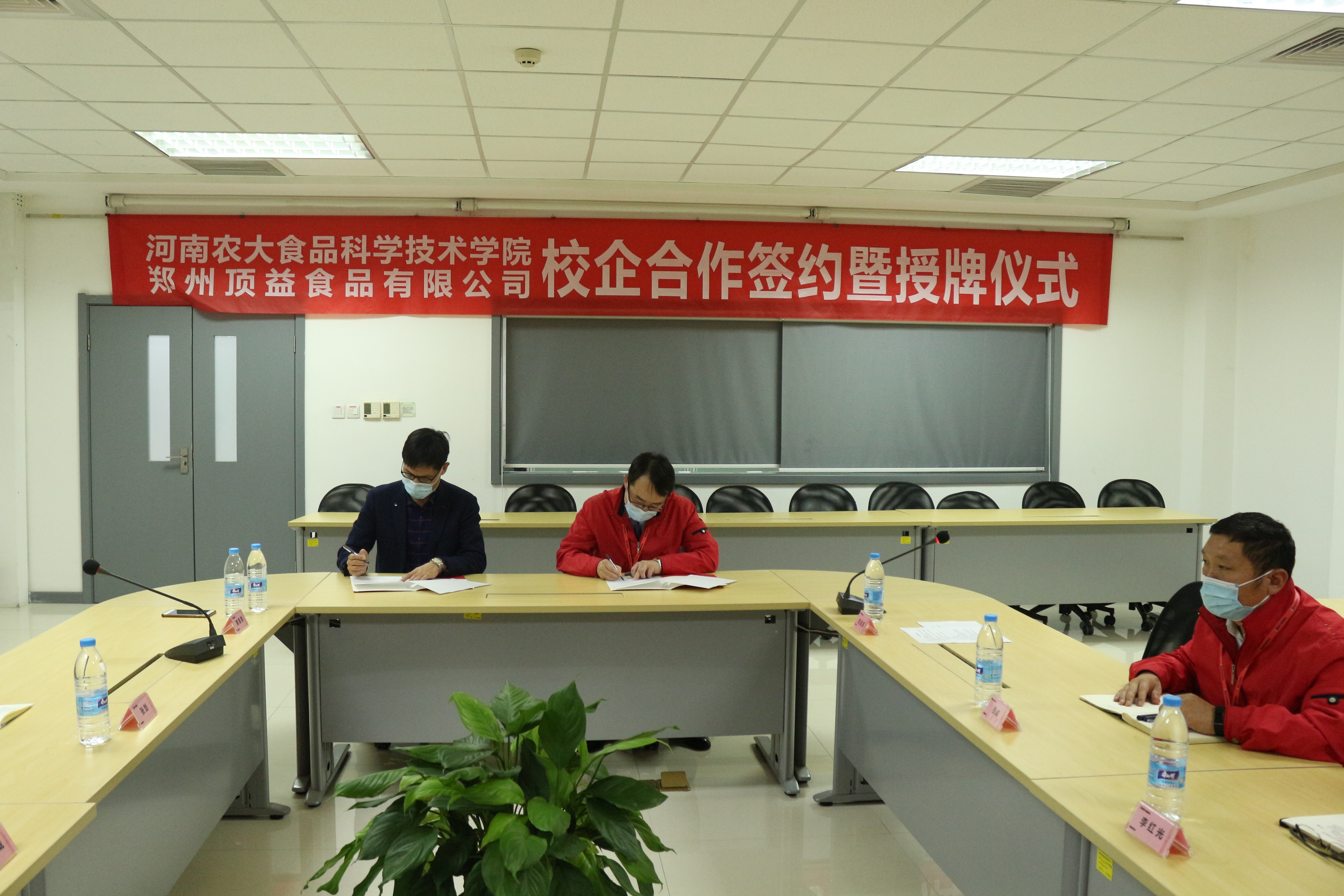 院长黄现青、副院长张剑、教师代表张建威、范会平、梁栋和康师傅郑州分公司厂长刘继涛、处长岳威、人资主管吴彦坤等厂领导参加了签约授牌仪式。