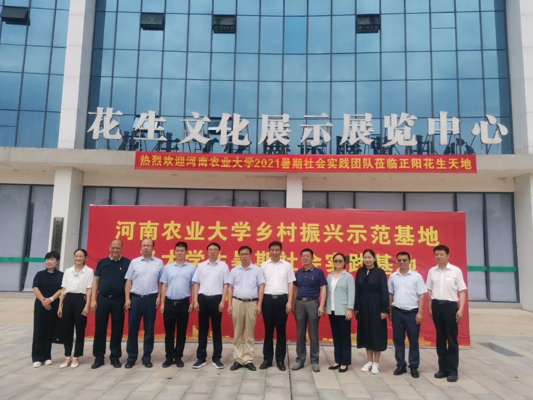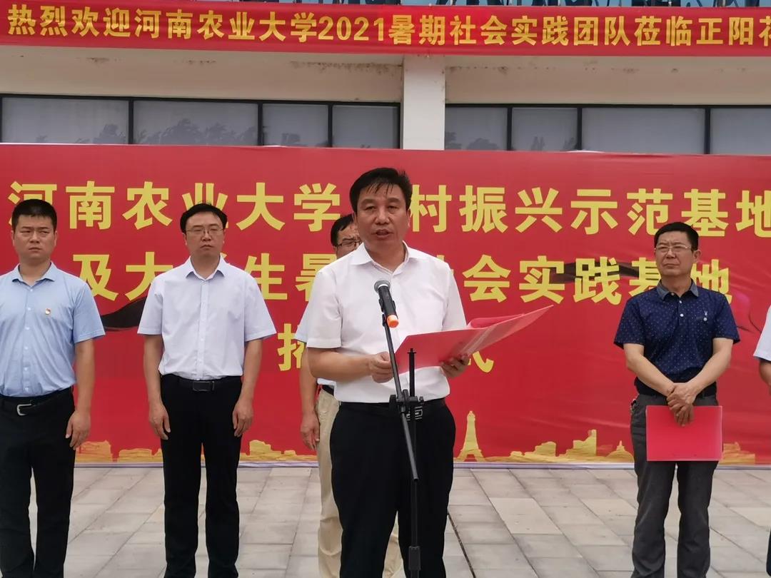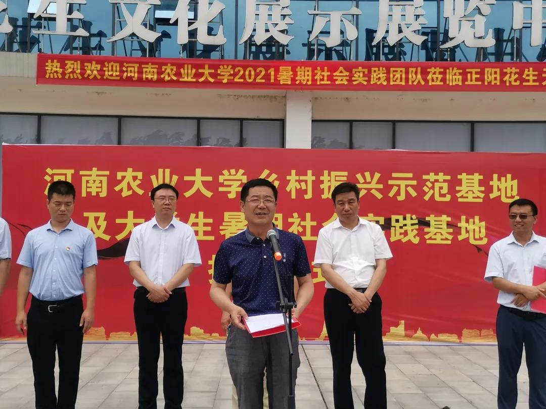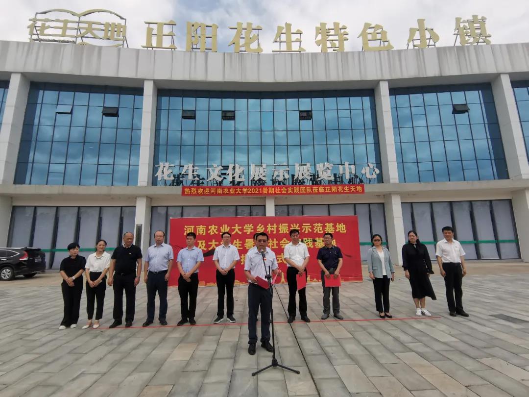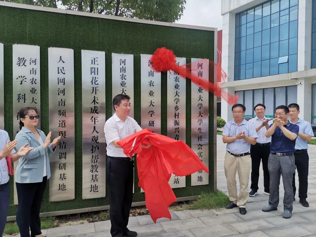 乡村振兴志愿者服务站等四个基地的揭牌仪式于正阳县新地花生集团举行。正阳县委常委、常务副县长蒋贵印、副县长马红珍、县检察院检察长侯亚军,新地花生集团董事长李广海,校党委研工部部长张红阳、社会服务处副处长赵建中、校团委副书记曹永甲,亚洲色吧