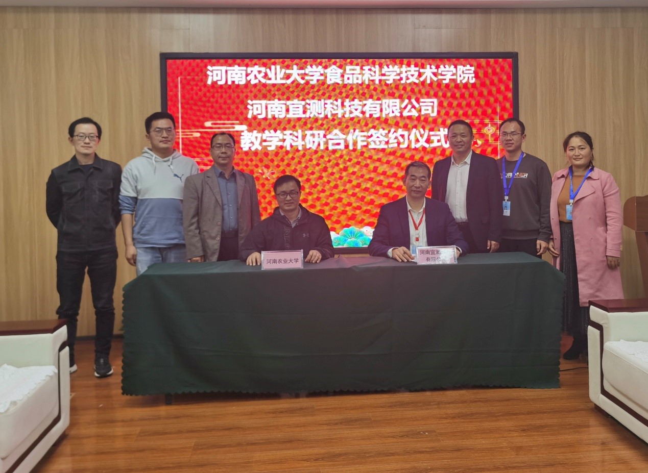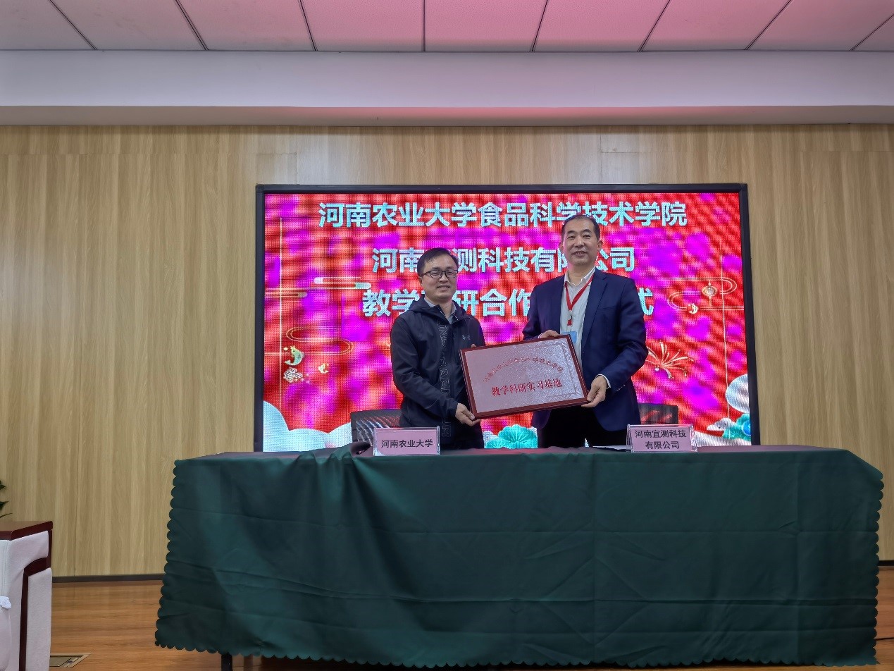 (通讯员 李占超 闫爽)2021年11月3日上午,在副院长谢新华带领下,食品营养与化学系主任高晓平副教授、闫爽博士、李占超博士一行4人赴河南宜测科技有限公司,参加教学科研合作协议签约授牌仪式。河南宜测科技有限公司总经理段尚波、副总经理兼技术负责人李秀丽、河南昊特生物科技有限公司总经理符春彦、总经理助理李叶、质量负责人周卫星、研发部研究员杨海涛、公司客服主管刘娟等出席了签约授牌仪式,总经理助理李叶主持会议。