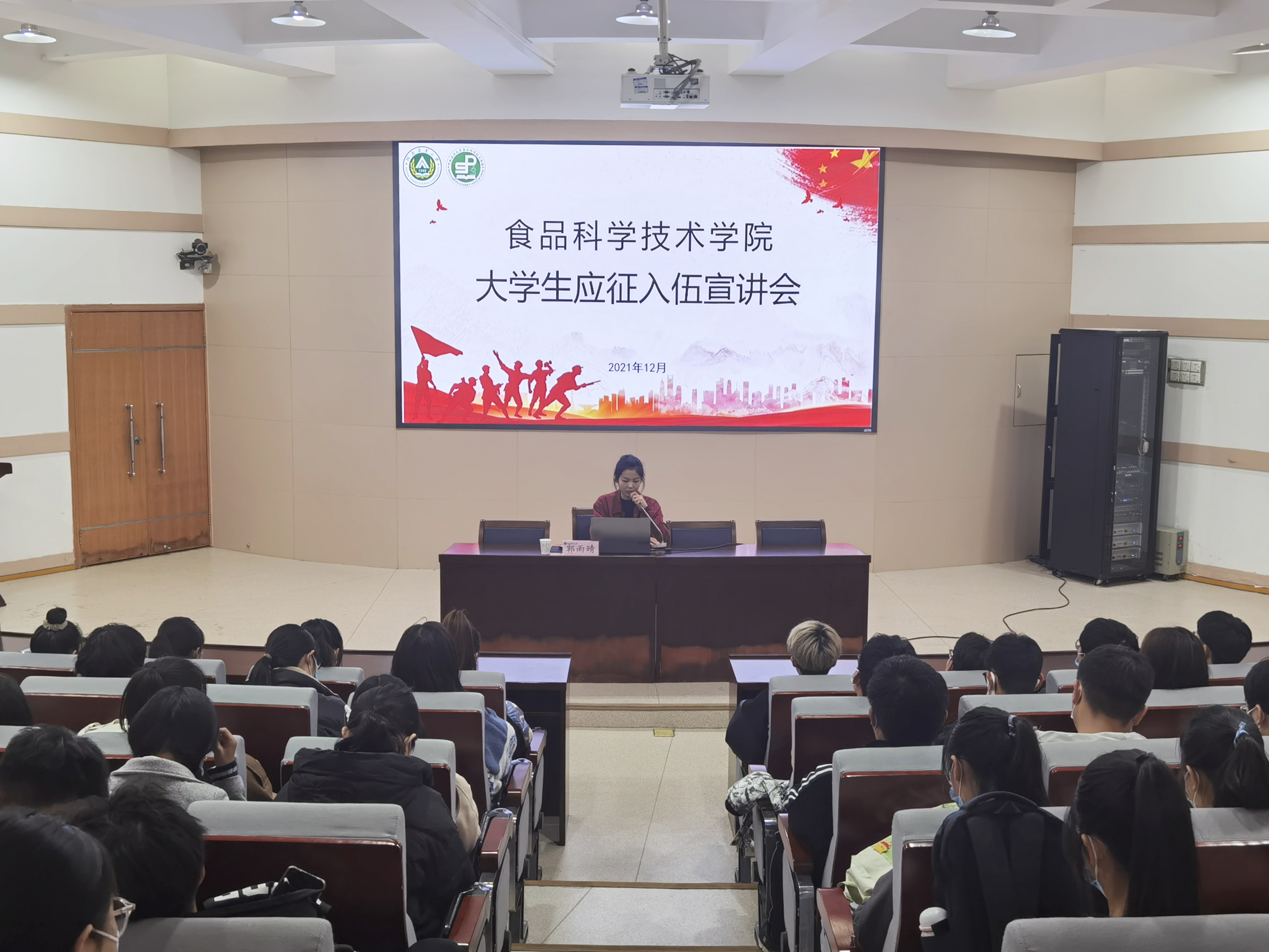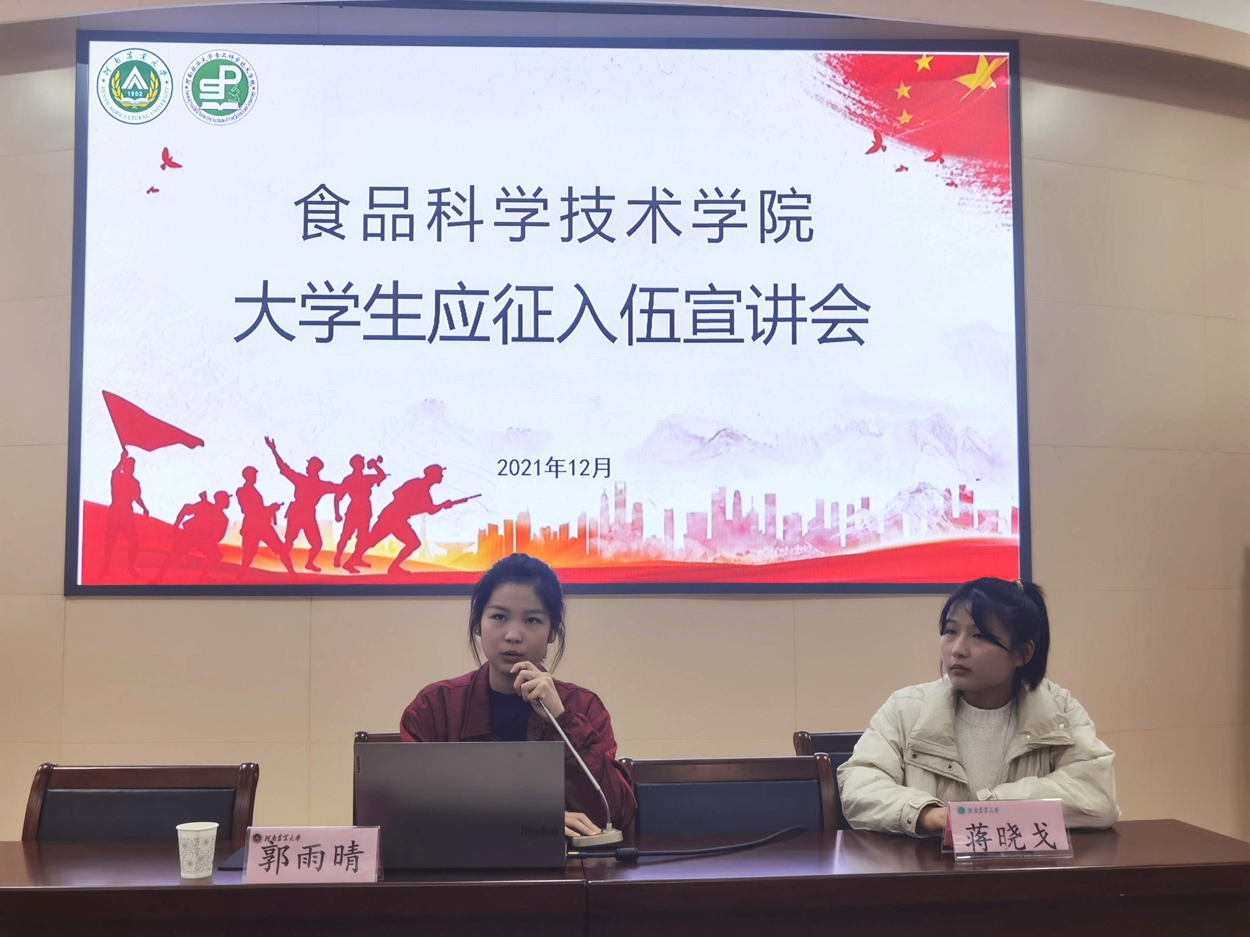 于文化路校区第一报告厅召开大学生应征入伍宣讲会,院团委书记路平、院辅导员张金龙出席会议,邀请18级食检二班蒋晓戈、19级食检二班郭雨晴分享入伍经历,21级全体学生参加会议。