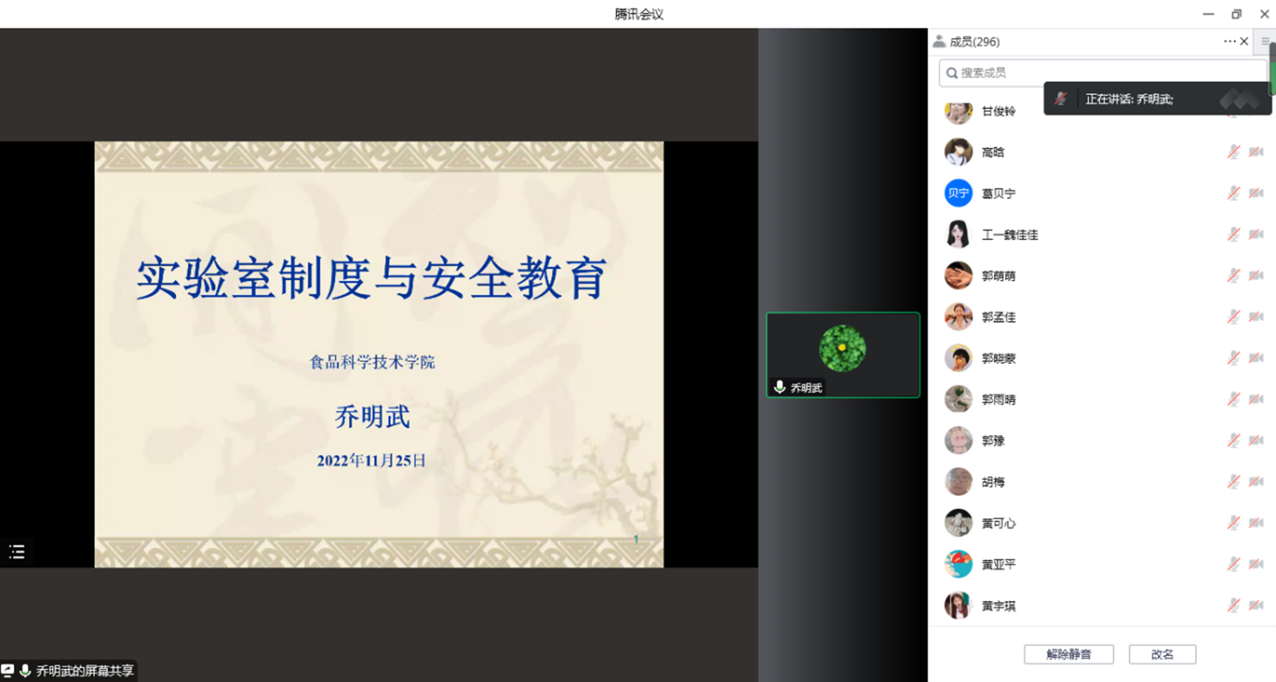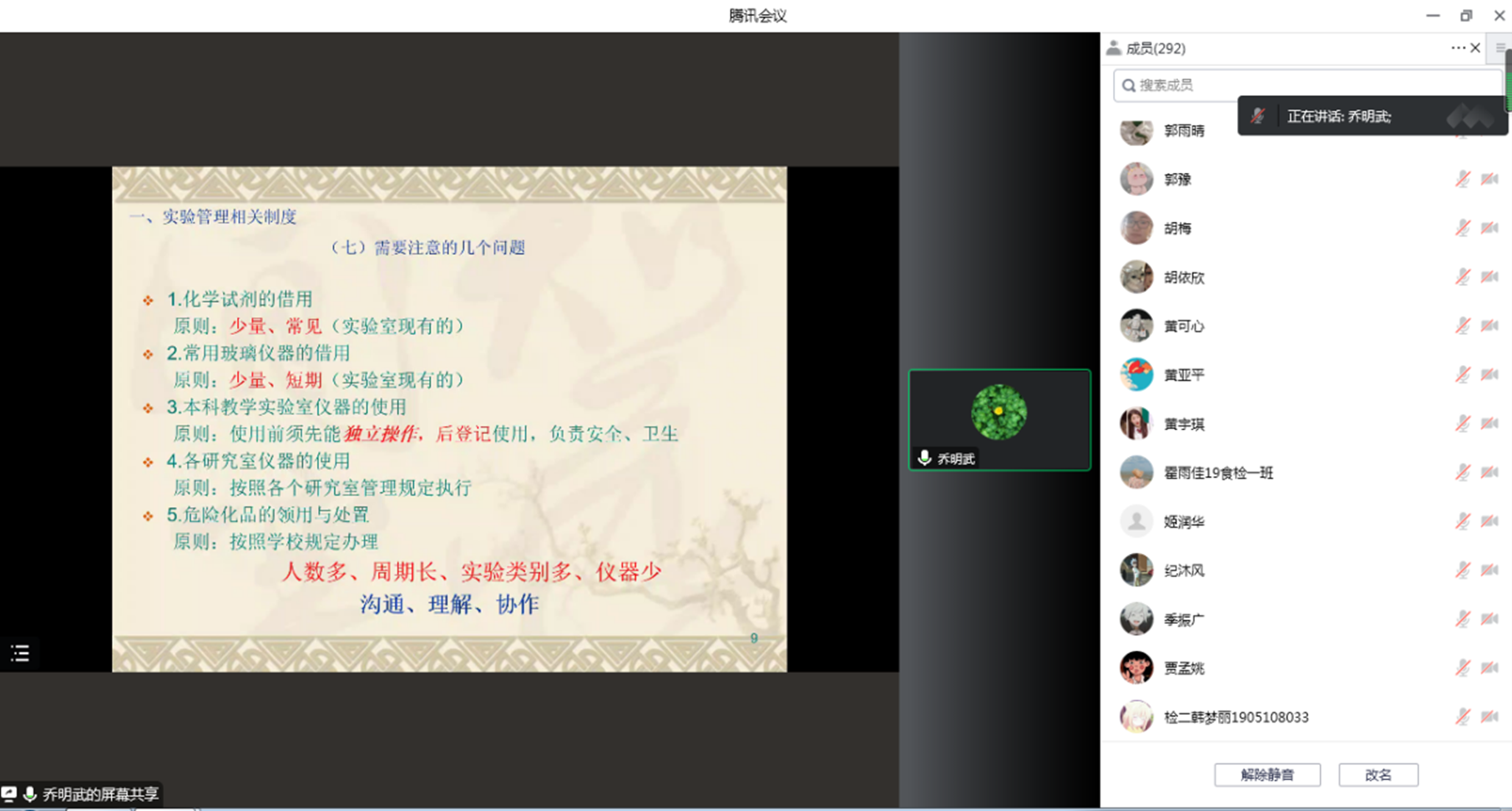 乔明武对实验室管理规章制度和安全教育内容进行详细讲解。他从用水、用电、化学试剂等方面强调了一些实验注意事项,并希望同学们能够树立实验安全意识,严格遵守实验室各项规定,在实验过程中与导师、实验室负责老师进行“沟通、理解、协作”,及时解决问题,防止实验室安全事故的发生。