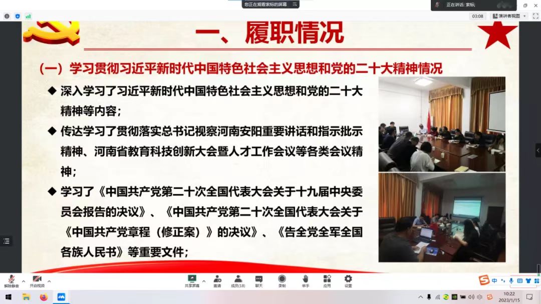 会上,李蓓蓓宣读了《2022年度党支部书记抓党建述职评议考核工作方案》的工作要求和相关注意事项,教工党支部书记分别从学习贯彻习近平新时代中国特色社会主义思想和党的二十大精神情况、履行党支部党建责任情况、党支部建设情况、基层党支部战斗堡垒作用发挥情况、存在问题及改进措施五个方面进行了述职。学生党支部提交了书面述职报告。