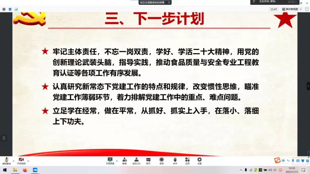 院党委副书记李蓓蓓向各支部提出了三点要求。一是,提高认识,加强基层抓党建的紧迫感,把进一步学习党的二十大精神作为今后一段时间的重点工作。二是,超前谋划,开拓创新,确定各支部工作亮点。三是,着力解决党员的民生问题,多关心困难党员,把党的关怀传递到每一位党员心中。