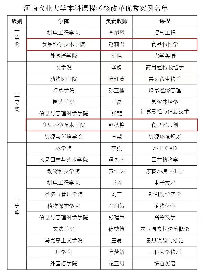 食品科学与工程系赵莉君老师主持的《食品物性学》荣获一等奖,食品营养与健康系赵秋艳老师主持的《食品添加剂》荣获二等奖。