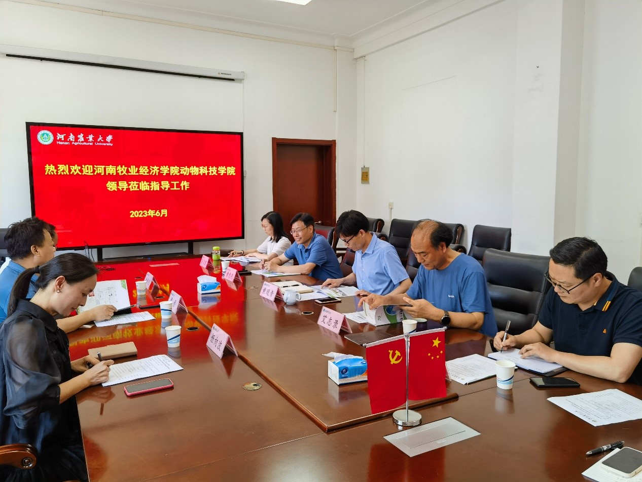 黄现青院长对河南牧业经济学院动物科技学院一行的来访表示热烈欢迎,并介绍了参会人员。黄现青院长详细介绍了学院省部级重点实验室建设、师资、学生、科研和科研团队建设等基本情况。席磊院长介绍了河南牧业经济学院动物科技学院的发展情况、实验室管理运行基本情况等。双方重点对省级重点实验室管理运行机制方面的工作深入交换了意见。