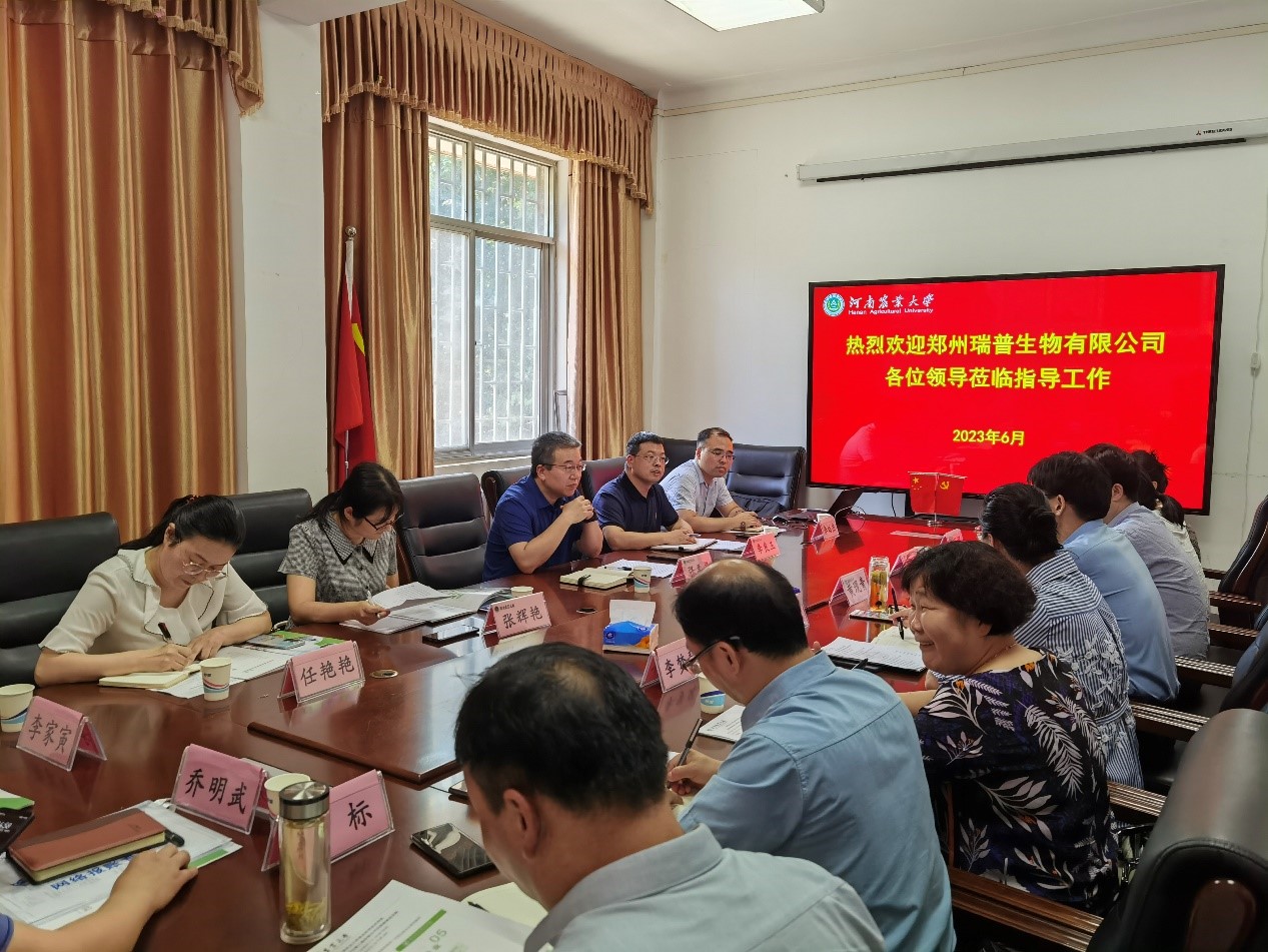 黄现青院长对郑州瑞普生物工程有限公司一行的来访表示热烈欢迎,并介绍了参会人员。张剑副院长详细介绍了学科与师资队伍建设、教育教学与人才培养、科学研究、社会服务等发展基本情况。张要华介绍了郑州瑞普生物工程有限公司基本情况以及企业发展现状等。双方重点对产学研、人才培育、学生实习与就业方面的工作深入交换了意见,签订合作协议,并举行了教学实习基地签约暨揭牌仪式。