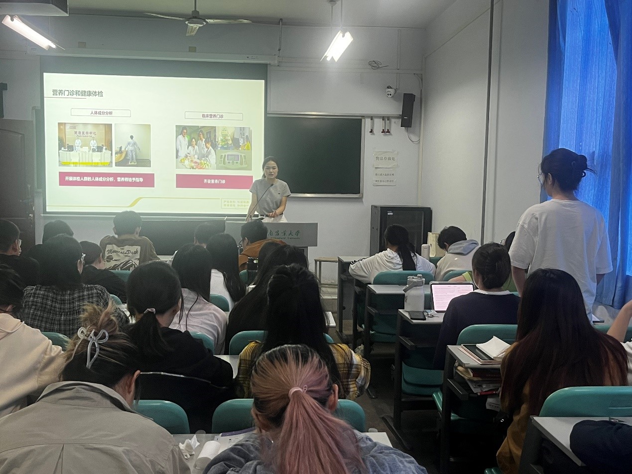 首先,姚亚茹营养师以《营养工作的精髓:实战经验的启迪》为题,首先向同学们全面介绍了郑州人民医院及临床营养科的工作概况。她还分享了在实际工作中所积累的经验与心得。例如:在营养干预工作中,她曾为一位糖尿病患者制定了个性化的膳食计划,通过减少高糖、高脂食物的摄入,增加富含膳食纤维的食物比例,以及合理安排餐次与进食量,该患者的血糖水平得到了有效控制,生活质量显著提高。随后,姚老师鼓励大家要拓宽信息视野,勇于抓住机遇,同时强调脚踏实地、勤勉工作的重要性,并特别提醒即将步入社会的同学们,无论是选择继续深造还是步入职场,都应明确自我定位,保持自信与理性,积极面对生活的挑战。