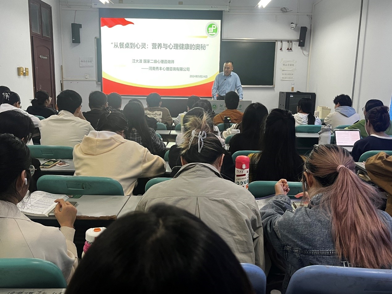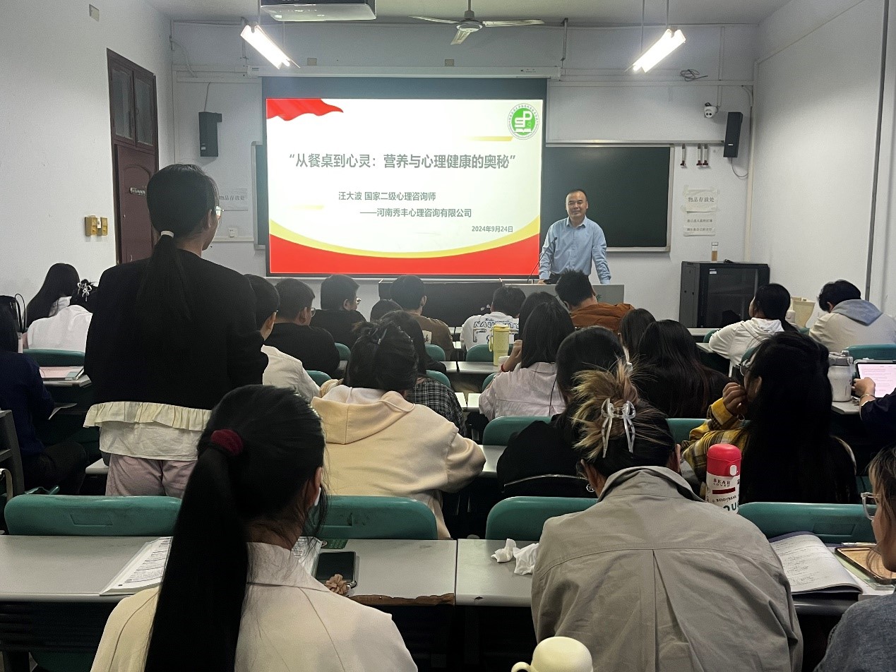 接着,汪大波老师以《餐桌与心灵的对话:营养与心理健康的奥秘》为题,从独特的视角出发,探讨了营养与心理健康之间的紧密联系。汪老师指出,合理的饮食对于调节情绪、预防心理疾病具有重要意义,如抑郁症、焦虑症等心理问题均可通过科学的饮食调理得到缓解,比如,某些食物如富含色氨酸的香蕉和坚果类食物,可以促进大脑合成血清素,从而帮助人们缓解压力、改善情绪。他鼓励同学们在面对压力时,不妨尝试通过调整饮食来调节情绪。大四学生正处于人生的关键阶段,更应注重营养摄入、加强运动与保证充足的睡眠,以维护身心健康。他还特别强调了人际沟通与情绪管理的重要性,鼓励同学们培养强大的内心世界,无悔于青春岁月。