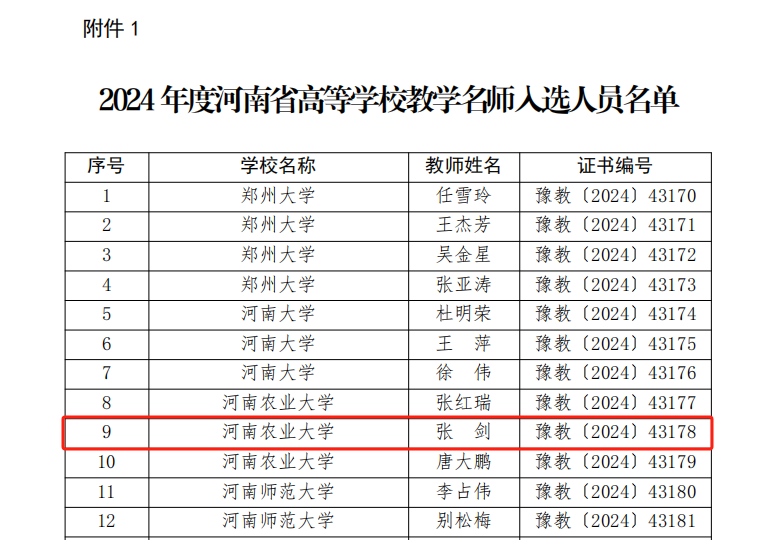 为落实高校立德树人根本任务,激励引导广大教师潜心教书育人,表彰在教学和人才培养领域做出突出贡献的教学名师,根据《关于开展2024年度中原英才计划—中原教育教学领军人才和河南省本科高校教学名师申报工作的通知》(教办高〔2024〕262号),经学校申报、专家评审和结果公示,河南省教育厅共评出50人为2024年度河南省高等学校教学名师,其中亚洲色吧 教授张剑获得此项荣誉。