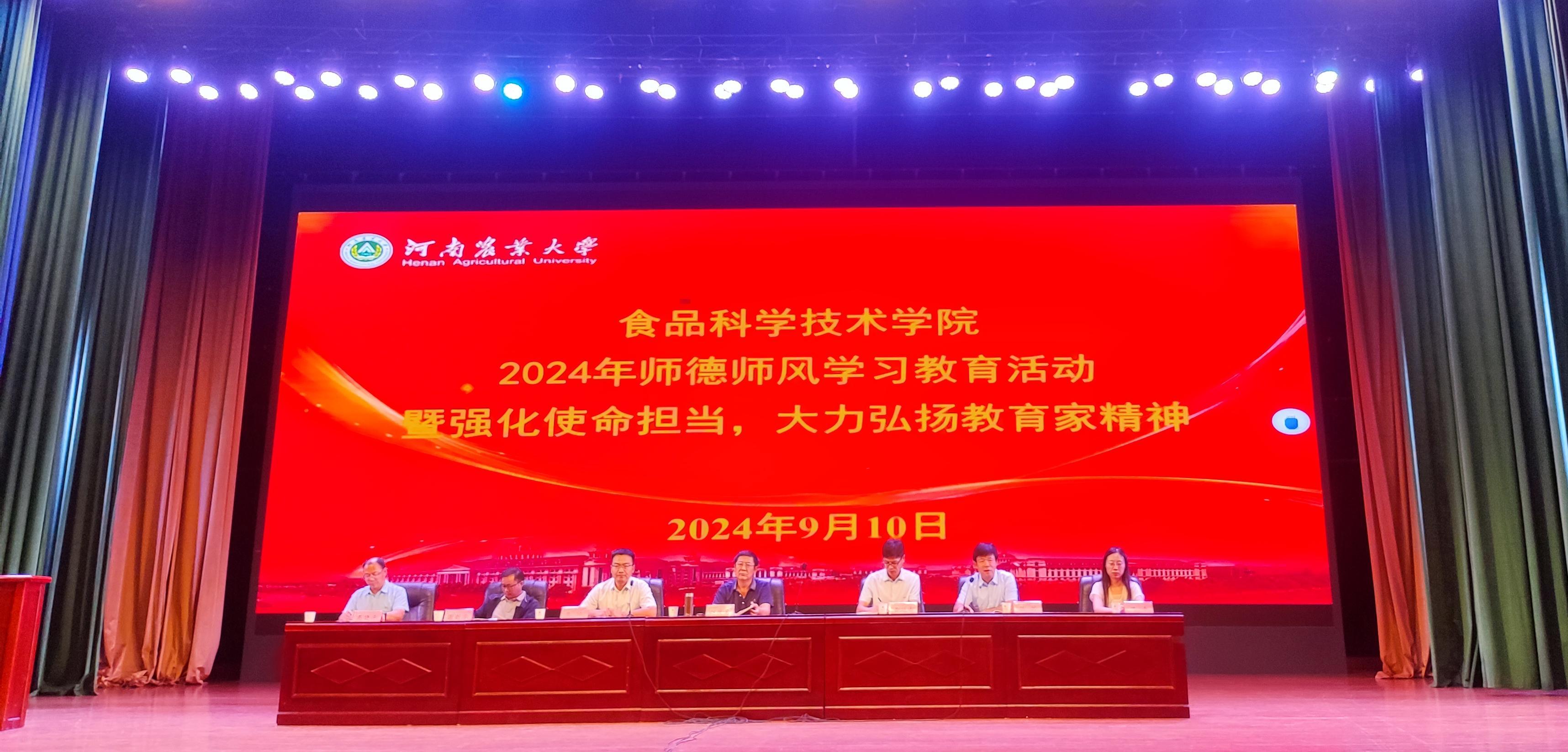 于2024年9月10日下午在文化路校区千人大礼堂开展师德师风学习教育活动——暨强化使命担当,大力弘扬教育家精神。学院领导班子成员及全体教职工参加会议,会议由教学院长张剑主持。
