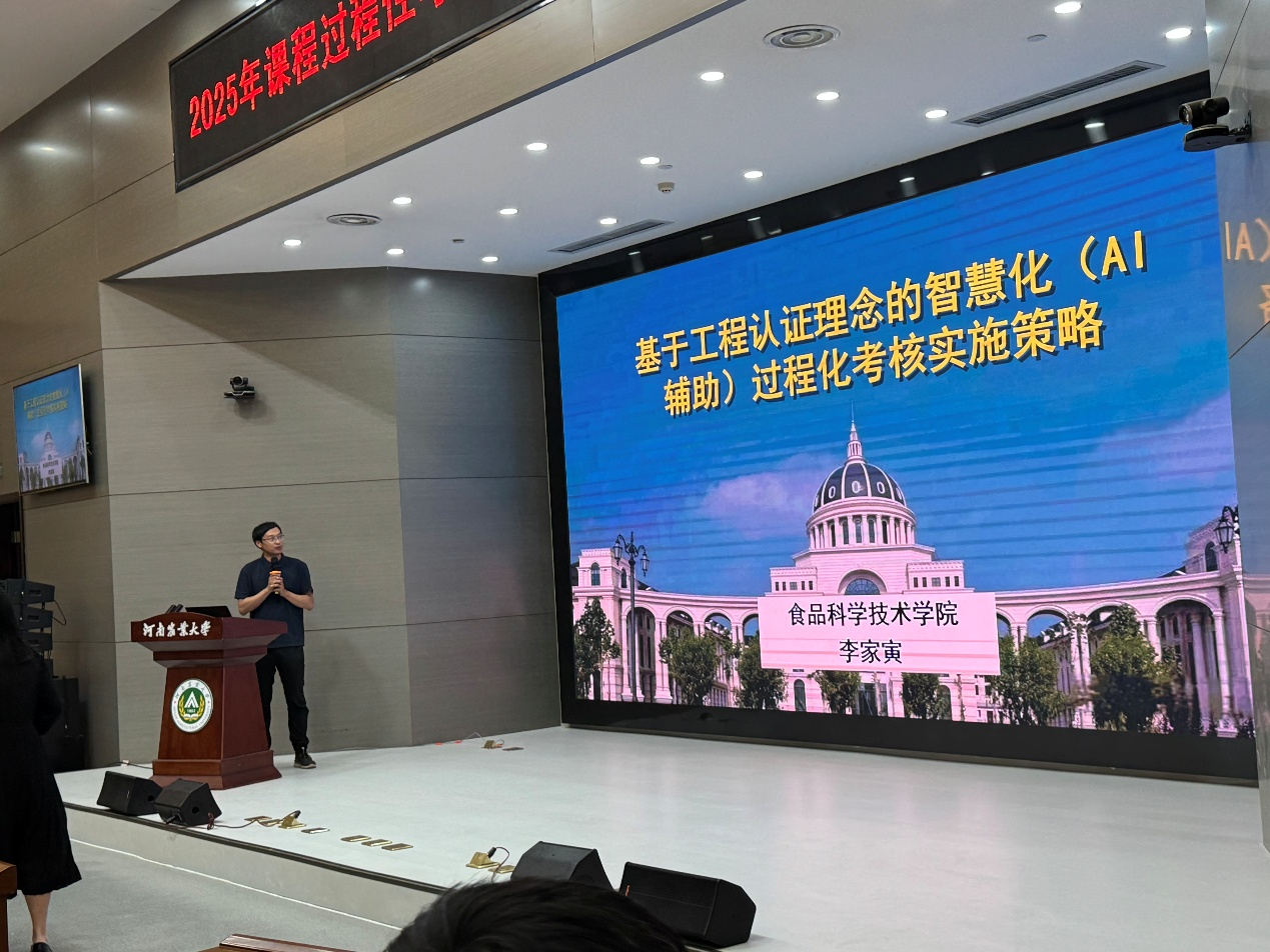 李家寅老师作《基于工程认证理念的智慧化(AI辅助)过程化考核实施策略》的专题报告。他结合主讲的《食品机械与设备》课程,系统阐释了如何将工程教育认证“OBE”理念融入过程性考核改革,并详细展示了如何应用AI工具辅助教师进行过程性评价,通过智能化工具分析考核数据,精准识别教学薄弱环节,实现“以评促教、以评促学”的闭环优化。其汇报内容逻辑清晰、案例详实,为跨学科课程考核改革提供了可复制的实践路径,受到与会专家和教师的高度关注。此外,林学院何静老师、资源与环境学院黄珺瑺老师、外国语学院宋扬老师也分别进行了汇报展示。
