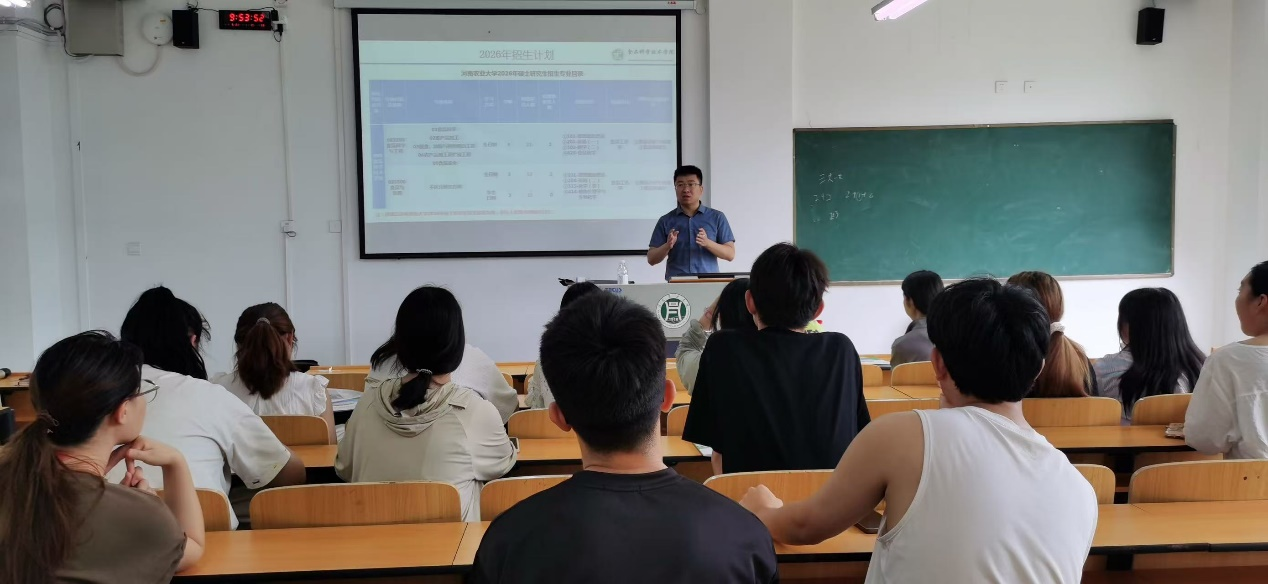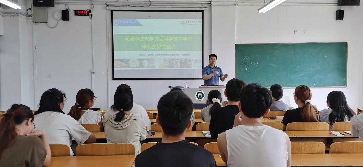 食品质量与安全系党支部书记王田林老师受邀到信阳农林学院食品科学与工程学院进行2026年硕士研究生招生宣传活动。信阳农林学院食品科学与工程学院22级本科生参加了本次宣讲会。