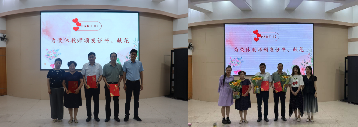 在悠扬乐曲中,激动人心的荣休表彰环节到来。院党委书记吴旭静和院长黄现青郑重为黄忠民、李梦琴、邵建峰三位荣休教师颁发纪念证书。随后,青年教师满怀尊崇,向三位荣休教师献上馨香馥郁的鲜花。