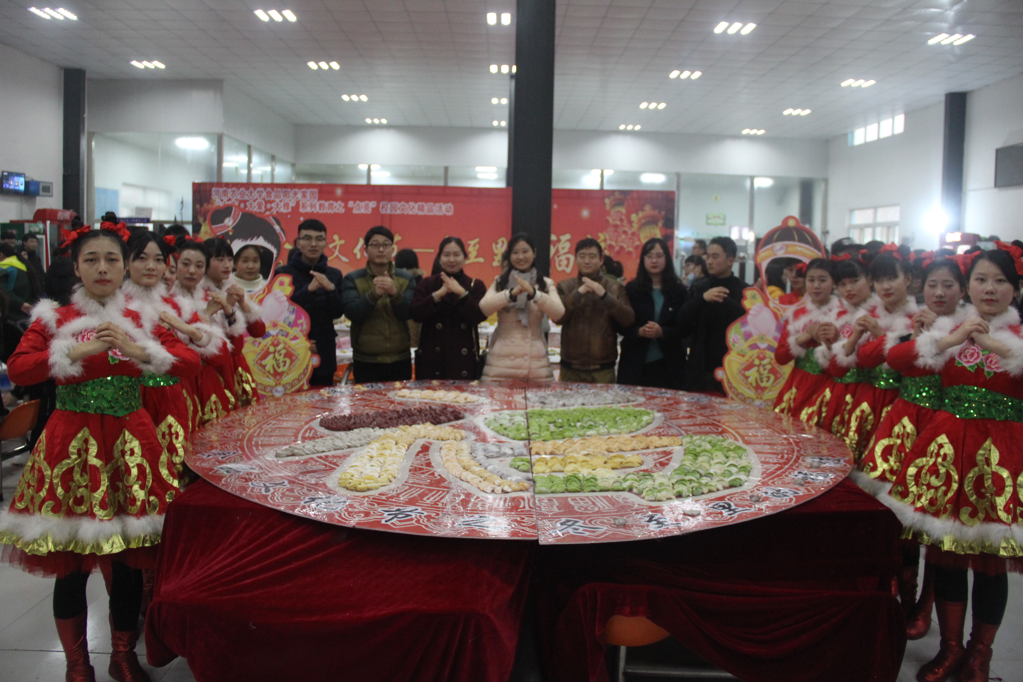 金鸡纳福,百福迎春。喜庆欢乐的歌唱,活力十足的舞蹈,幽默的小品“手机综合症”等开场节目精彩纷呈,现场氛围不断被推向高潮。接着进入到特别节目“冬至里的福饺”,学校及学院老师、学生“亲自下厨”,用橄榄菜汁、菠菜汁、胡萝卜汁等和面、集各地不同风俗习惯制作馅料,色彩缤纷的“彩饺”让人垂涎三尺。10名“福娃”将“福饺”摆于直径3米、7平方余的团型百福图上,取“纳百福”之意。此外,学院阳光志愿者协会代表将“福饺”和“福”字窗花送给环卫工人、建筑工人、社区老人、离退休教师等,向他们表示慰问和祝福,祝愿“国利民福”。