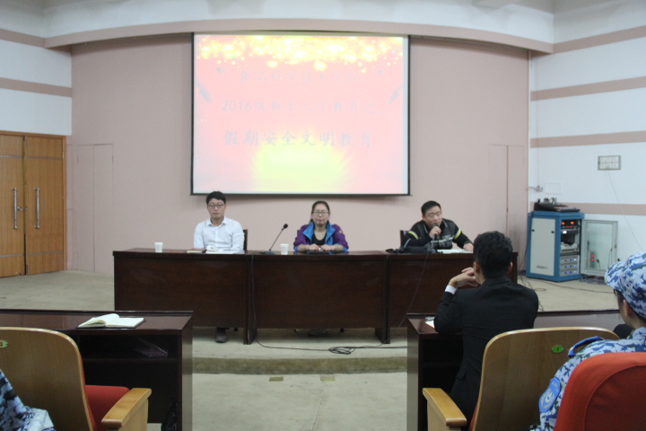 在文化路校区三百人报告厅召开了2016级新生入学教育之假期安全文明教育讲座。院团委书记李蓓蓓、院团委副书记杨光、院党委组织员张世昌出席讲座,全体2016级新生参加讲座。