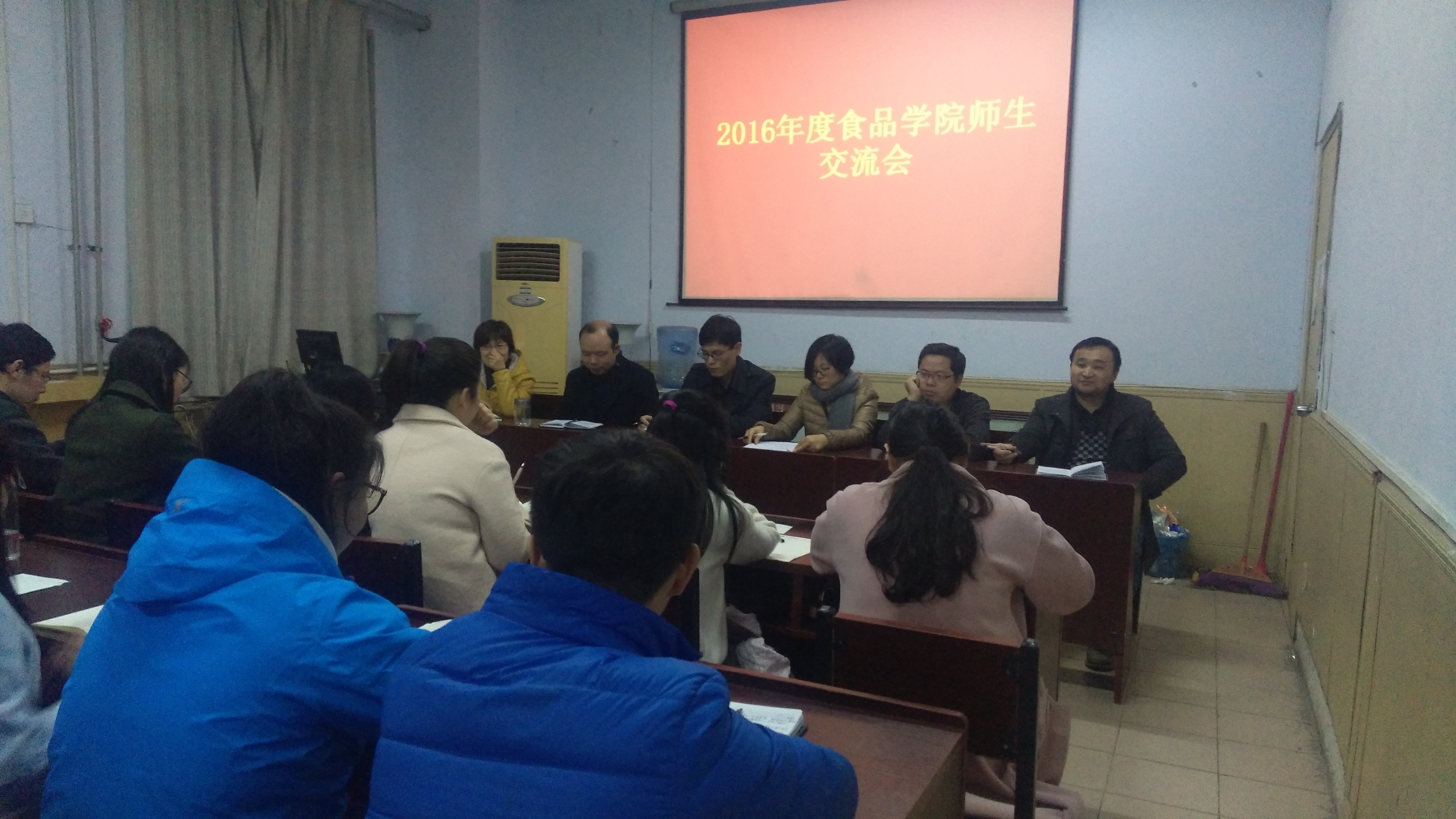 在一号楼会议室开展2016年度食品学院师生交流会。副院长黄现青,院教学秘书张剑,院实验中心主任张建威,院食品科学与工程系副主任范会平,院食品质量与安全系副主任索标,院食品营养与化学系副主任赵秋艳出席会议并与2015级学生代表进行交流。