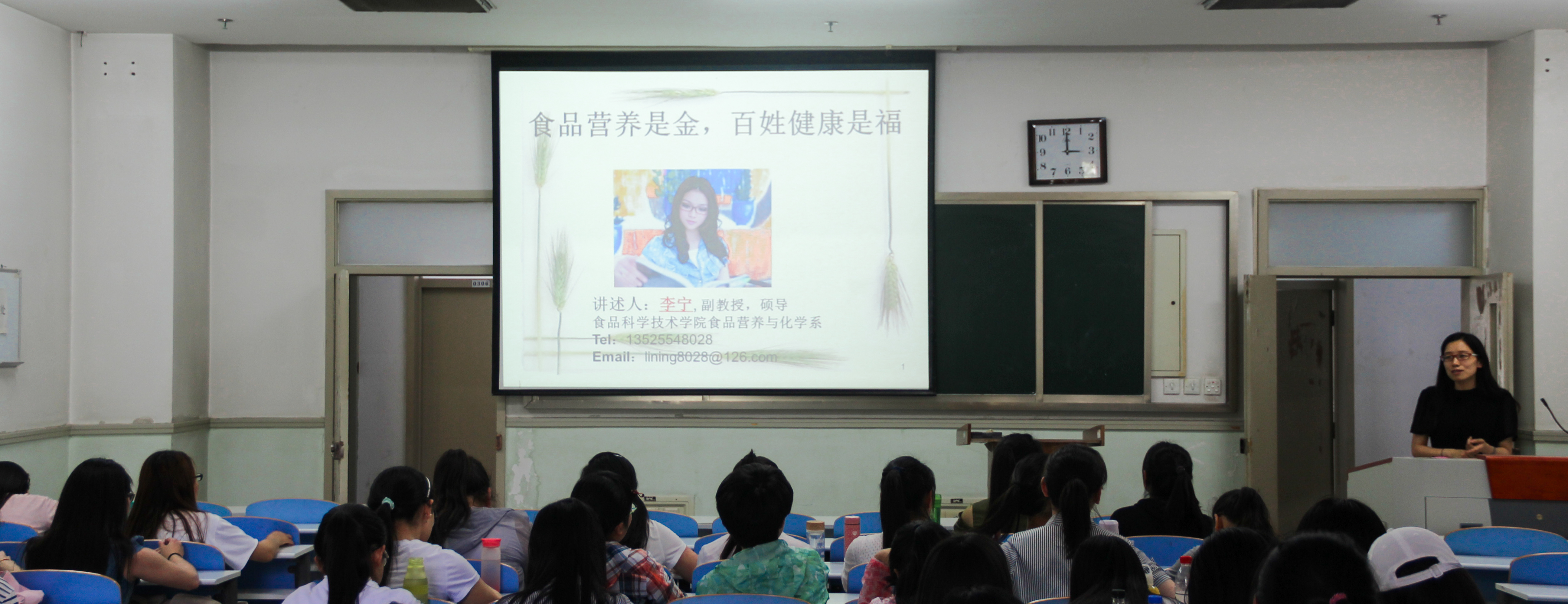 报告会以“食品营养是金,百姓健康是福”为主题进行讲述。首先,李宁由食品营养与疾病发病率之间关系引出社会对营养知识的巨大需求,并指出良好的生活方式是健康的基础。她强调“合理膳食、适量运动、戒烟限酒、心理平衡”是良好生活方式的核心。此外,李宁还介绍了相关趣味营养小知识,满足了当代大学生对美,智慧与快乐的追求。最后,李宁用全英文PPT分享了一段留学美国的经历,鼓励同学们把握好大学生活,砥砺前行!