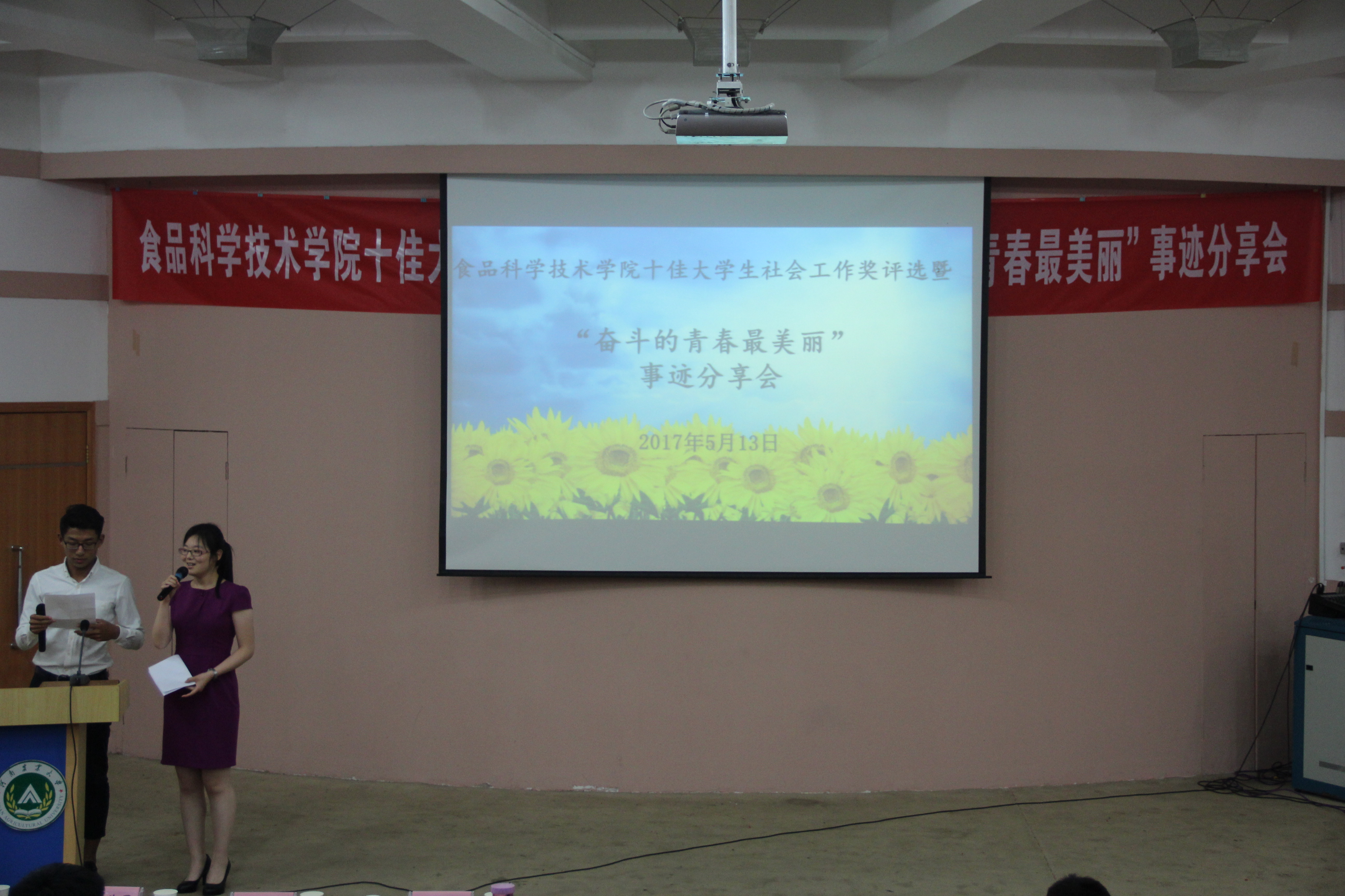 在文化路校区三百人报告厅举行十佳大学生、社会工作奖评选暨“奋斗的青春最美丽”事迹分享会。院团委书记李蓓蓓、院团委副书记杨光、院党委组织员张世昌、院辅导员孟子晴出席以及学院主要学生干部参加了此次活动。