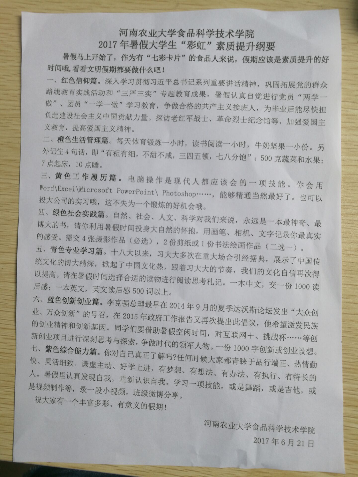 在全院范围内发放的《2017年暑假大学生素质提升纲要》,包括了信仰教育、生活管理、工作履历、社会实践、专业学习、创新创业、综合技能等七项假期素质提升活动,让学生在寓学于乐中撰写文章、完成、书法、绘画、纂刻、摄影、剪纸等艺术作品的制作。此外,还积极倡导养成早睡早起的好习惯、每天进行阳光锻炼一小时,让同学们的身心都得以提高。一项项素质提升活动,获得了同学们一致的好评,大家纷纷表示要充分利用暑期时间用知识的力量武装自己,充实漫长的暑期生活。