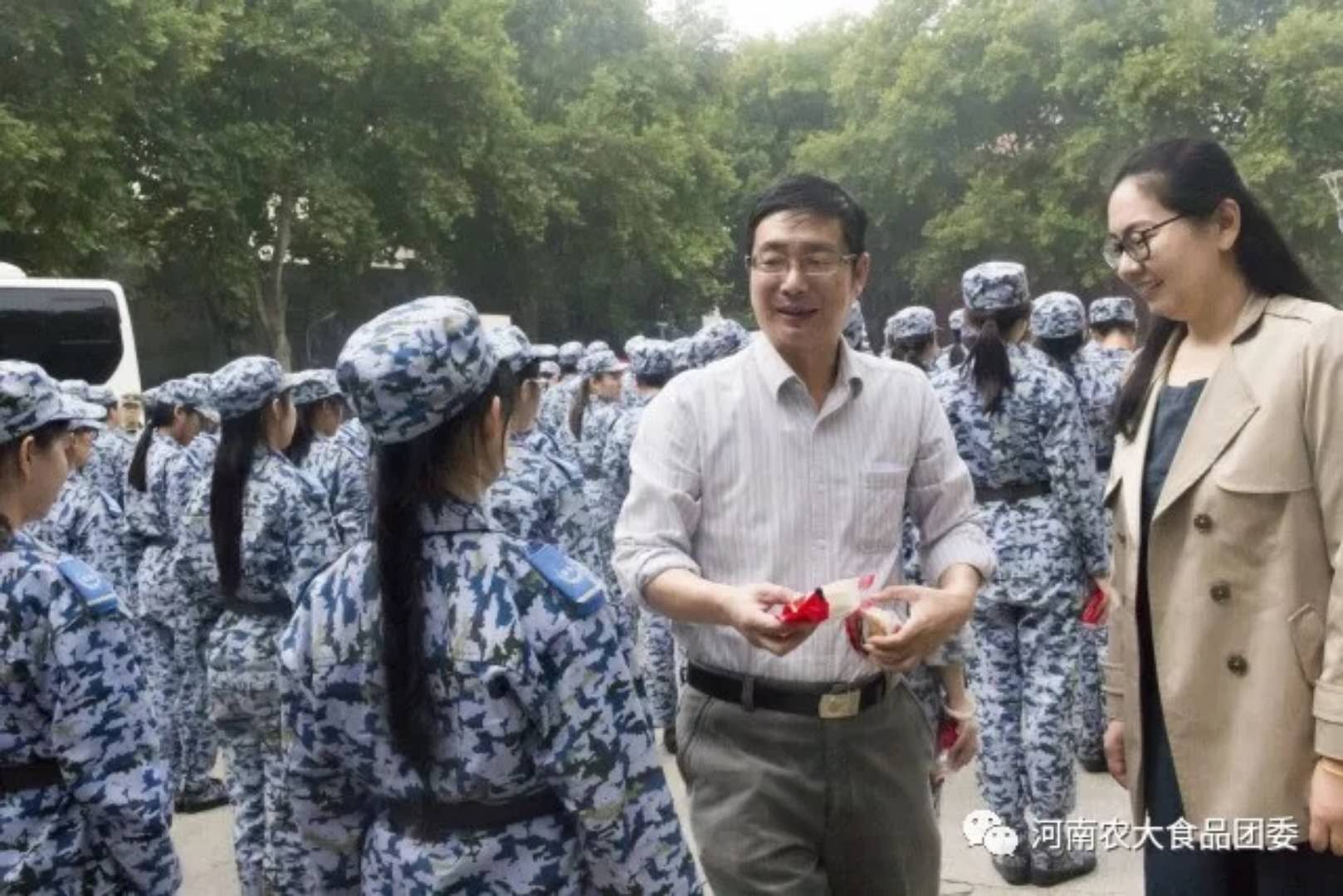 金秋送爽,丹桂飘香。在中秋来临之际,学院领导老师带着学院自制的月饼来到训练场地,与2017级新生亲切交流的同时,分发月饼、寄予期望、送去祝福。杨喜洲鼓励同学们要以积极向上的心态迎接军训及以后的大学生活,时刻铭记农大“明德自强,求是力行”的校训,以高标准要求自己,延续食品人敢于拼搏的精神。同时,他强调同学们一定要学好专业知识,培养兴趣爱好,提升自身素养,筑梦自己的人生。此外,赵改名详细询问了新生们的入校感受、住宿等情况,对外省同学从吃饭、语言、生活习惯等方面深入关心,并希望来自五湖四海的同学能够相亲相爱、友爱互助。现场充满了领导老师对同学们的期许与祝福,气氛融洽,其乐融融。