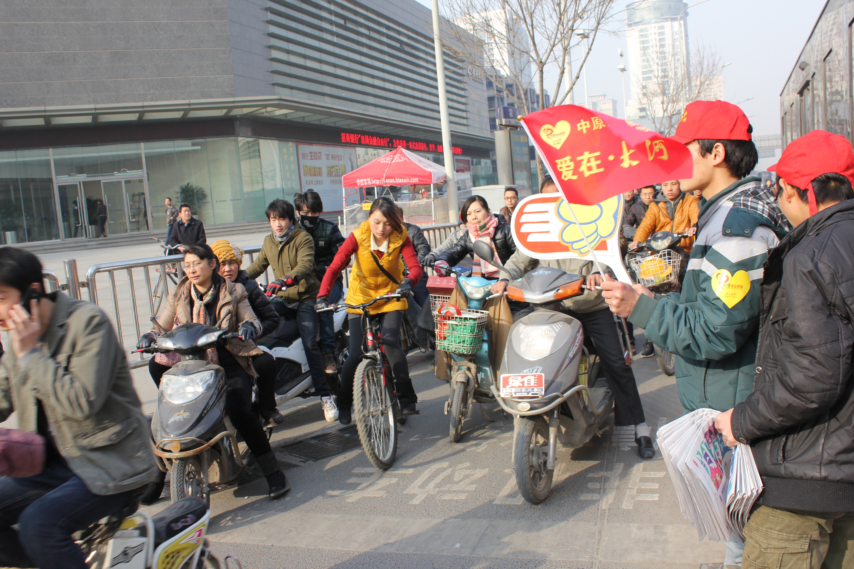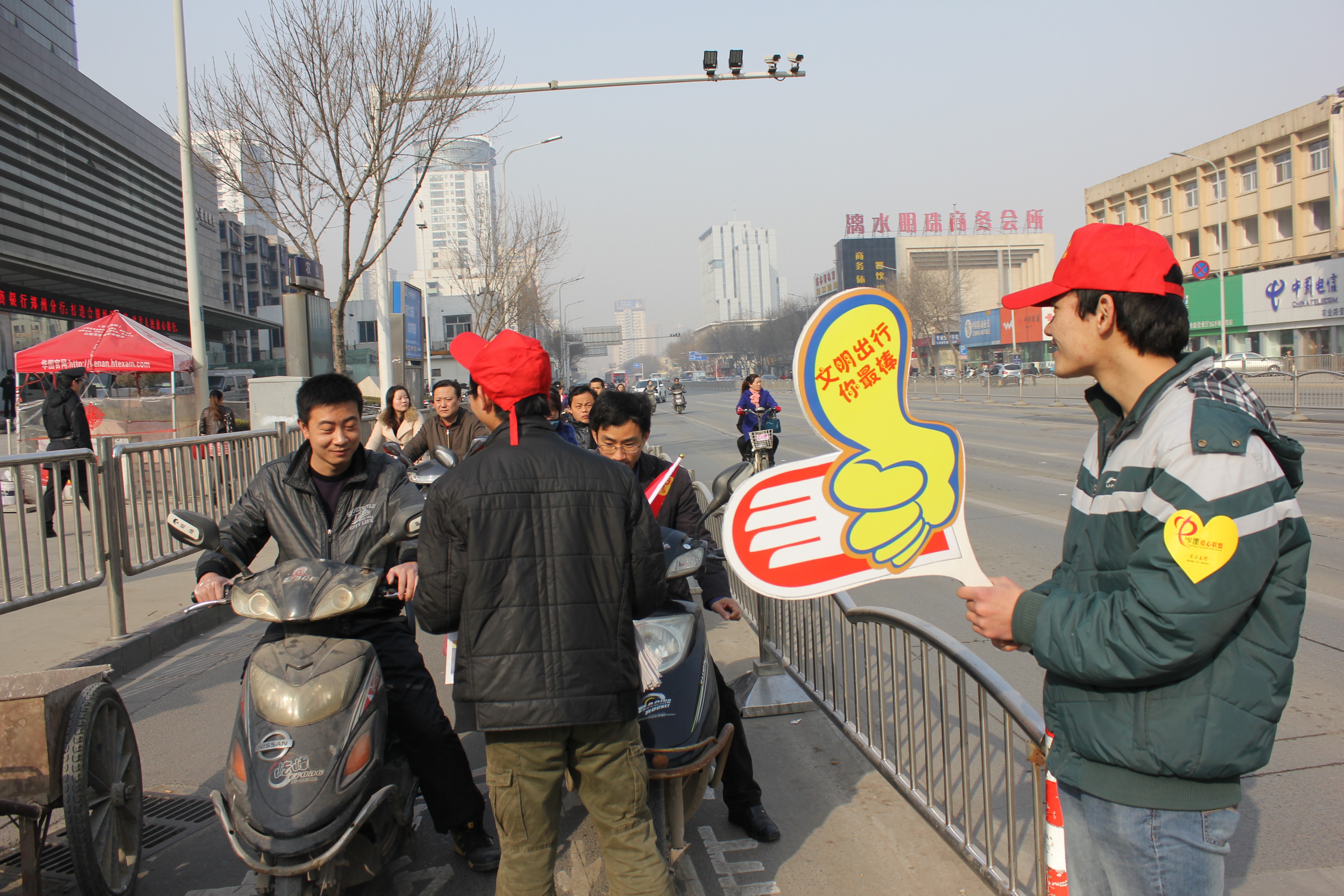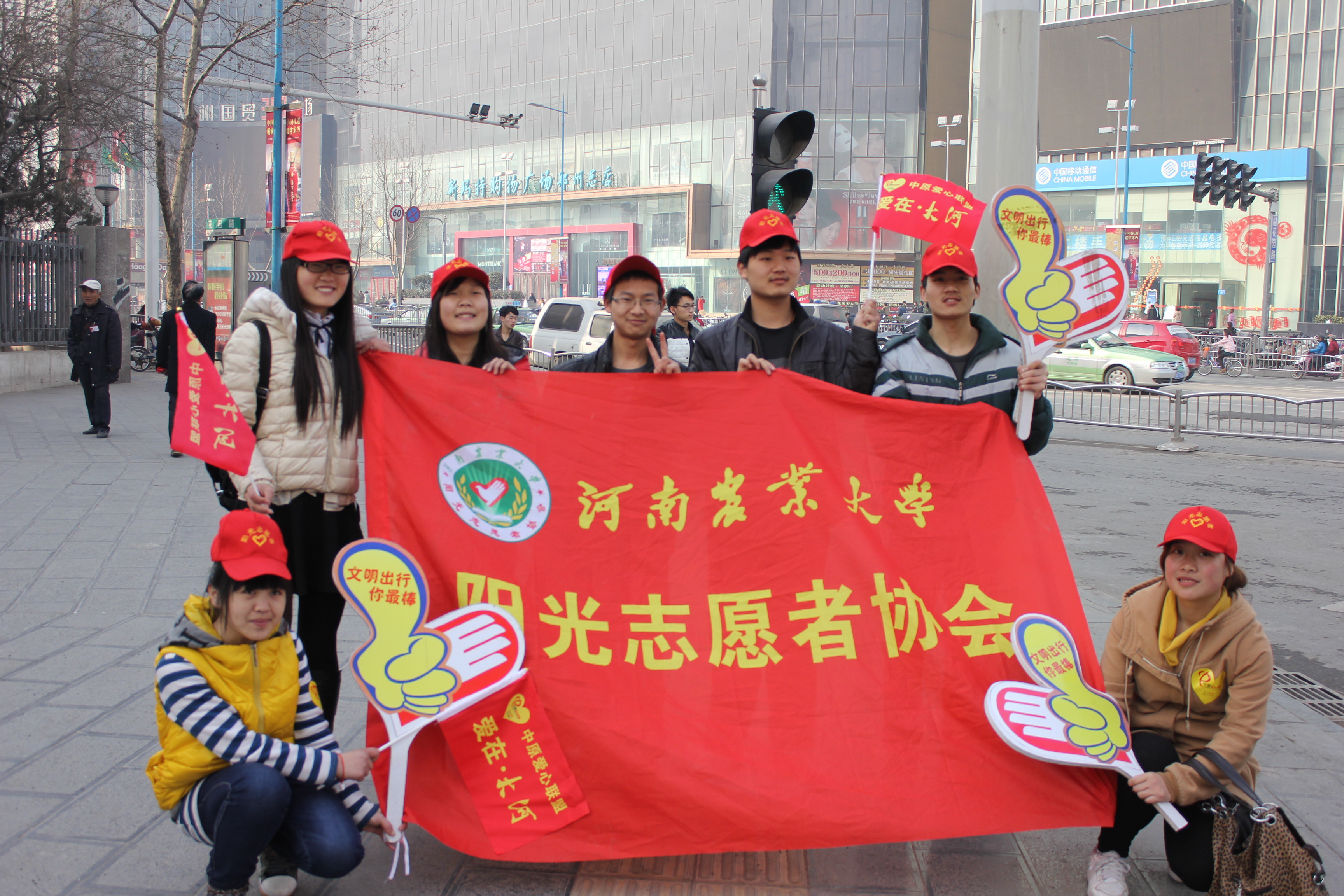 8点,校园东门,农业路与花园路交叉口一顶顶小红帽显得格外的醒目。志愿者们用热情的微笑,阳光的行动感染了很多行人。过往的行人纷纷表示:“这样的活动很有意义,年轻的志愿者们用行动提醒我们要发扬传承雷锋精神”。