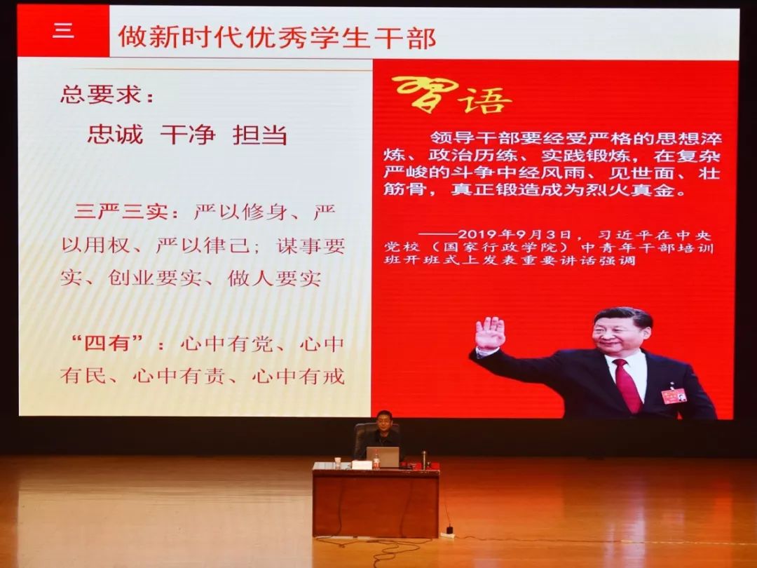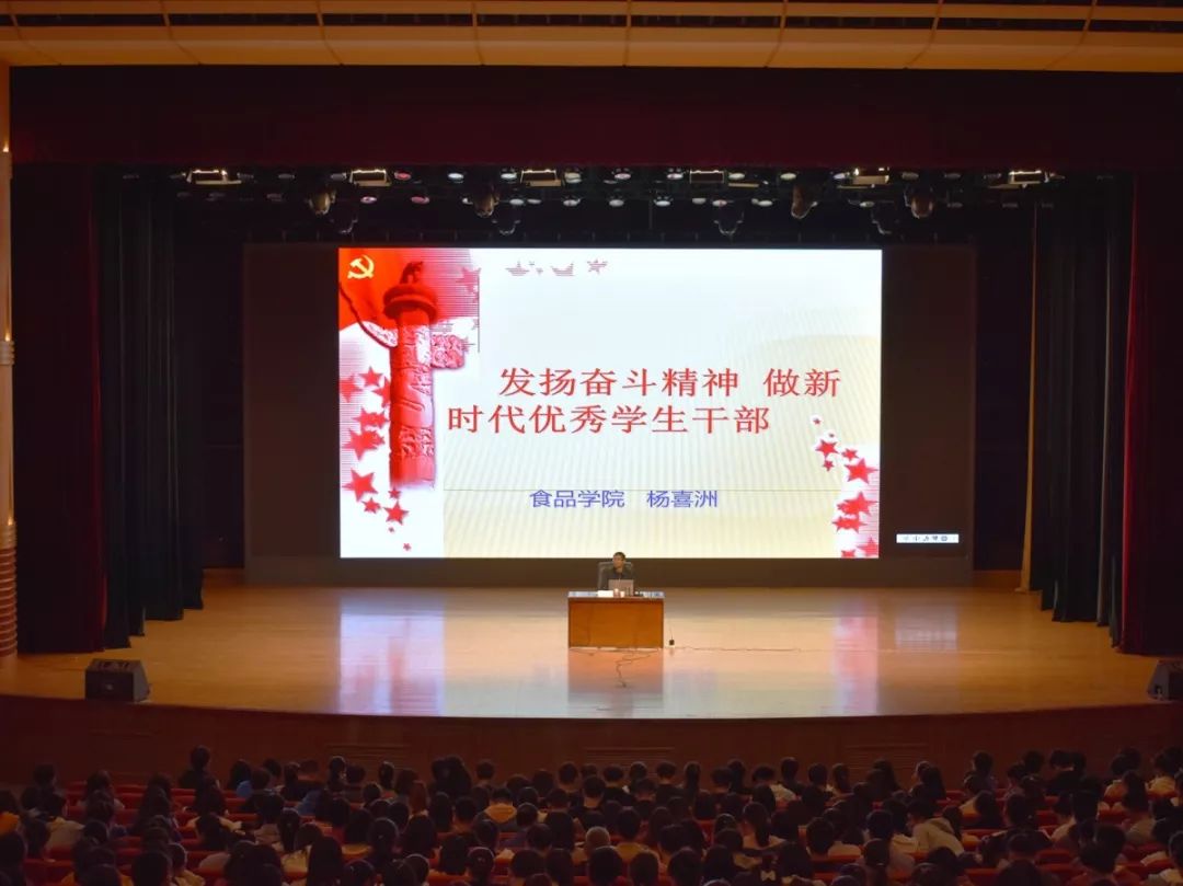 在文化路校区千人大礼堂召开“发扬奋斗精神,做新时代优秀学生骨干”成长成才报告会。院党委书记杨喜洲出席报告会并担任主讲,全体党员和学院学生代表参加报告会。