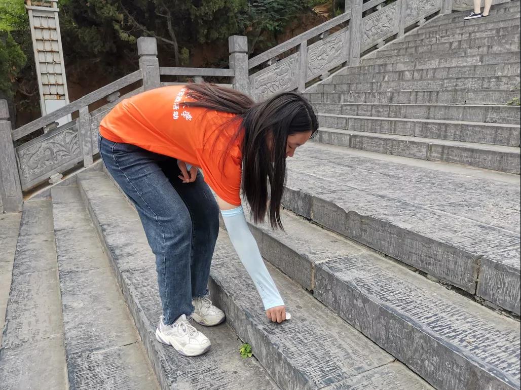队员们对青屏山当地的环境进行环保活动——捡垃圾,队员们对塑料瓶子、纸片、树叶、烟头等进行拾捡,并放进垃圾箱,为当地环境保护和文明建设贡献一份力量。