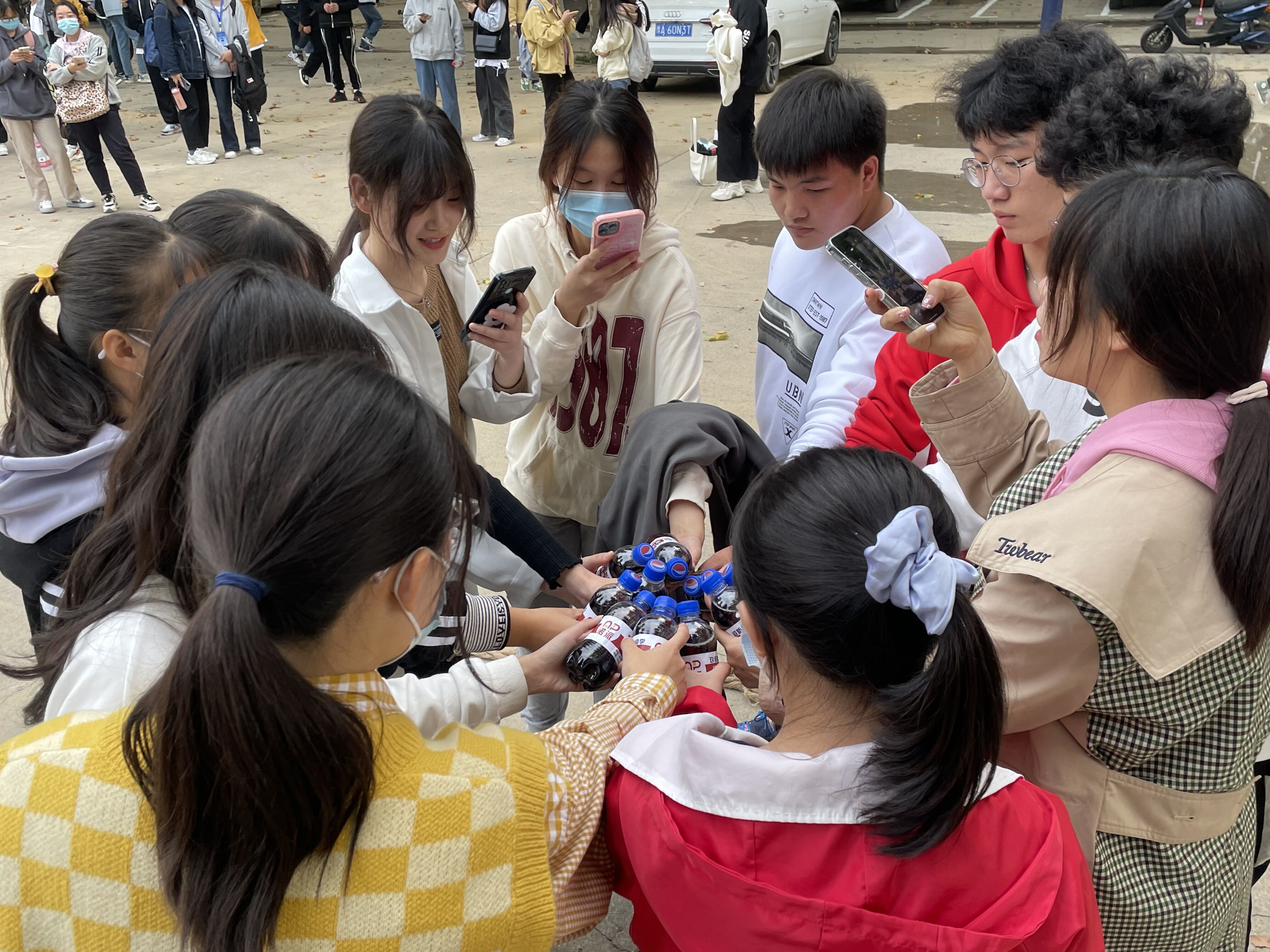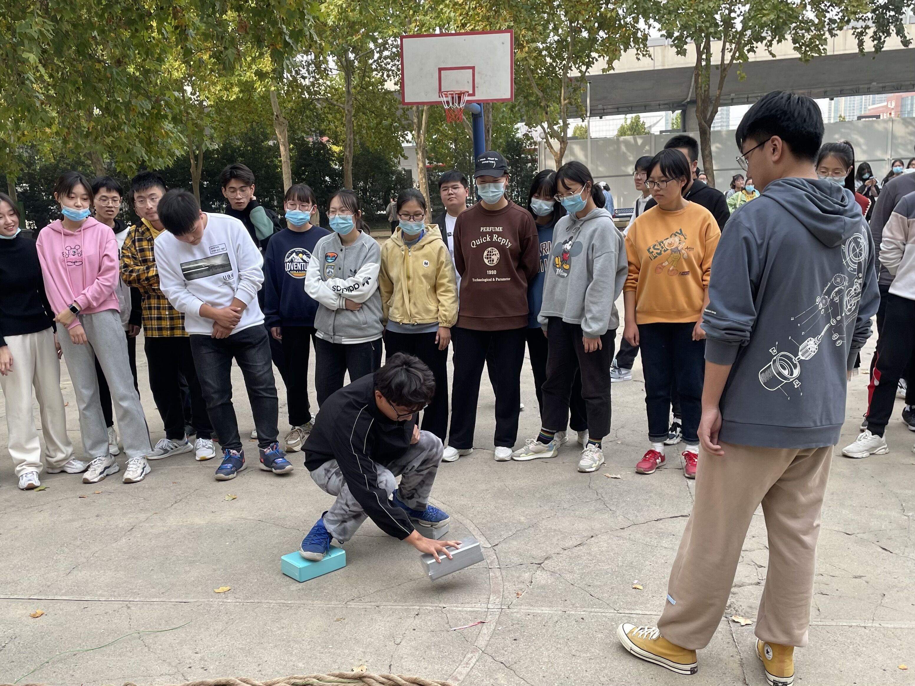 《摸石过河》项目中,参赛选手小心翼翼,手脚配合,稳步前进,其他同学或站在侧方保证安全或为选手们出谋划策,现场热闹非凡。《珠行万里》项目中,选手们聚精会神、团结协作,有条不紊地将小球送到目的地。一个球,八个人,相互配合,齐心前进,同学们在运动中感受到了团队合作的魅力。