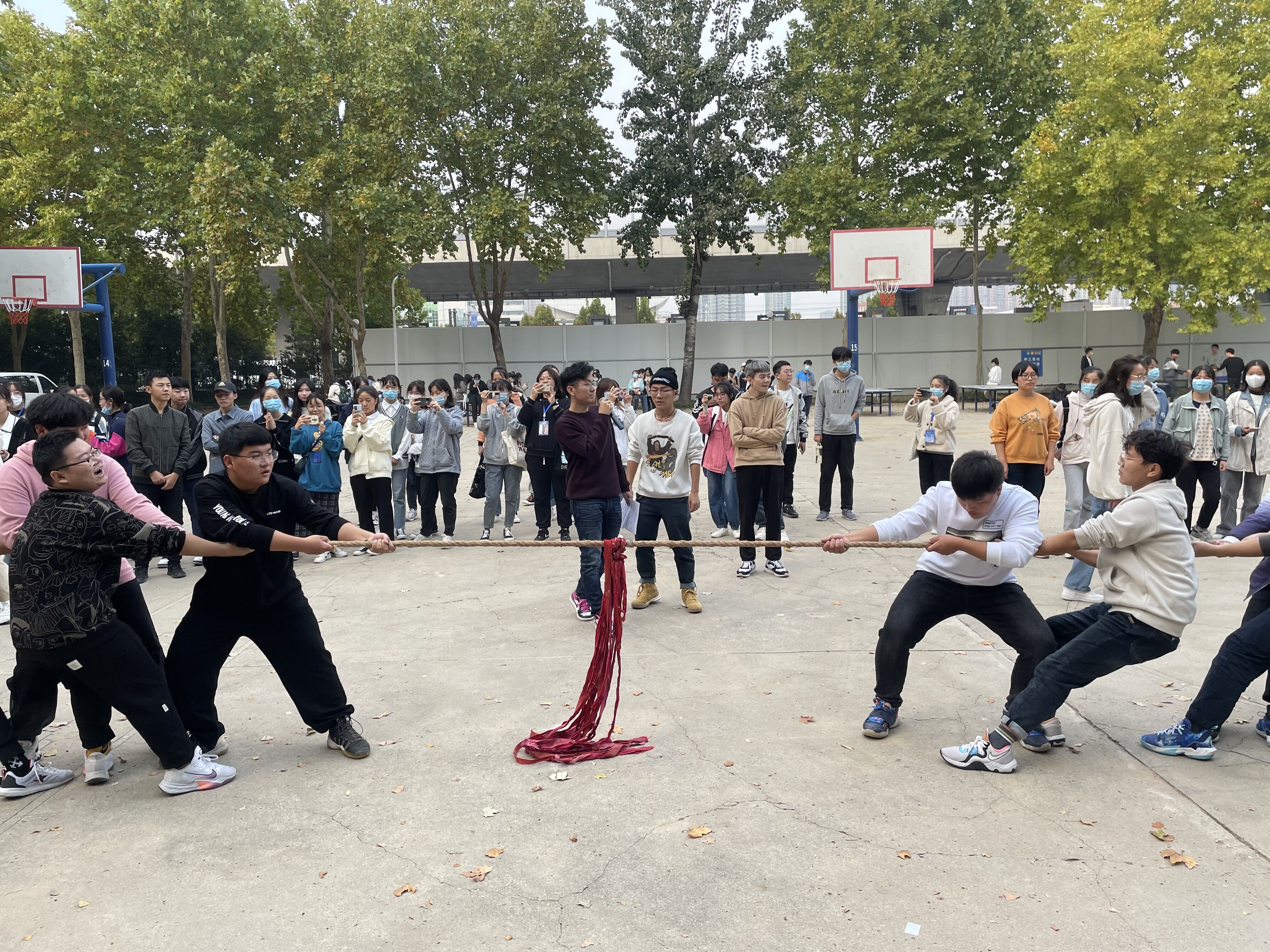 到了激动人心的拔河环节,随着裁判的一声哨响,只见参赛队员紧握绳子,倾斜身体,卯足了劲将红绳拉向自己,“一二、一二”,每一声口号下都是一股力量的迸发,无论场上场下,气氛都异常热烈。运动会结束后,为获奖队伍颁奖。同学们都很疲惫,但仍难掩他们脸上的喜悦。