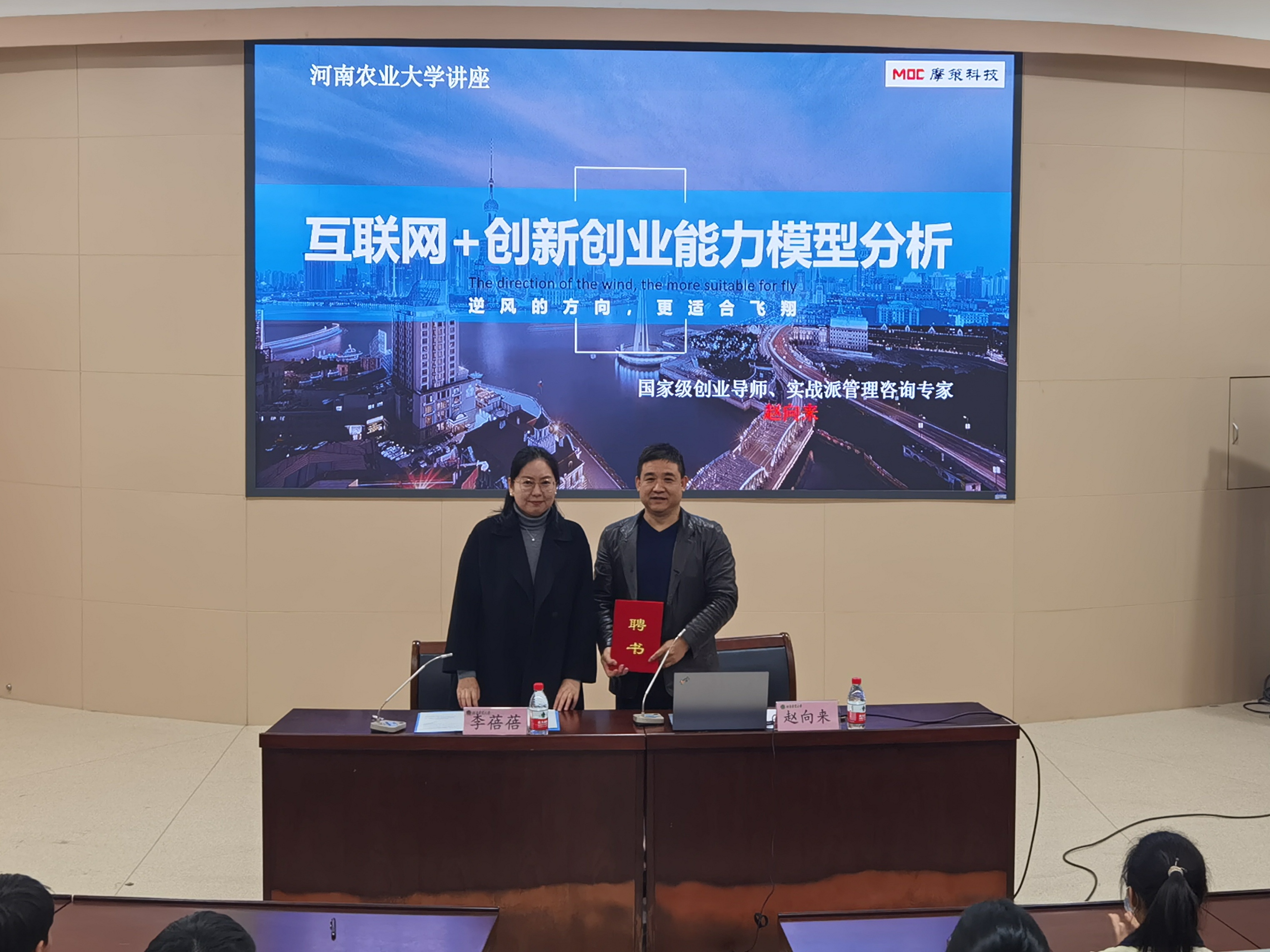 于300人报告厅举办“4C”创新创业讲堂,特邀河南省大众创业优秀导师赵向来担任主讲,院党委副书记李蓓蓓、院团委书记路平出席活动,各学院学生积极报名参加。