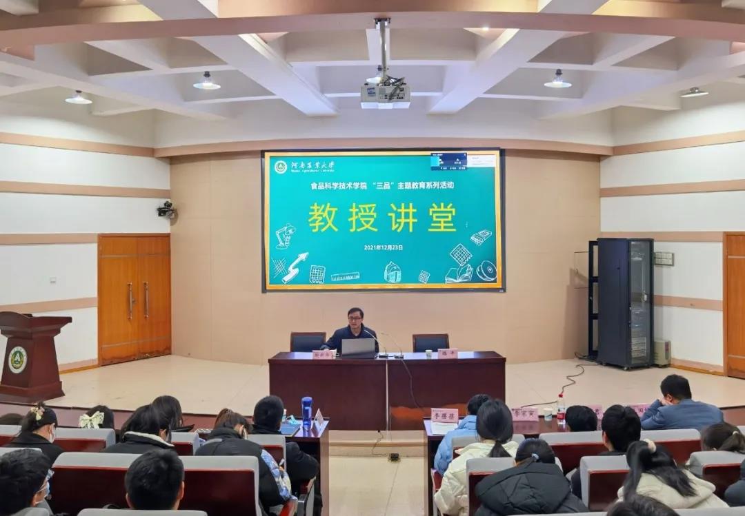 于文化路校区第一报告厅召开“三品”主题教育系列活动——教授讲堂第三期,副院长谢新华向大家作了题为《胶体在食品中的应用》的精彩报告,21级全体同学参加,此次会议由院团委书记路平主持。