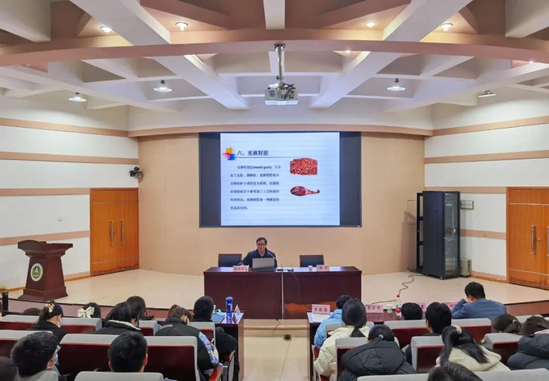 谢新华就胶体在食品中的应用展开讲述,分别从胶体的种类、性质、应用等方面向同学们详细地介绍胶体,又具体讲述了黄原胶、聚葡萄糖、亚麻籽胶、麦芽糊精、γ-聚谷氨酸等五类物质,并列举日常生活中常见的可食性食品胶体,使同学们对胶体有了更加全面的认识和了解。他强调胶体具有多种功能性质,现作为食品配料或食品添加剂,已被广泛应用于各种食品中,具有良好的发展前景。
