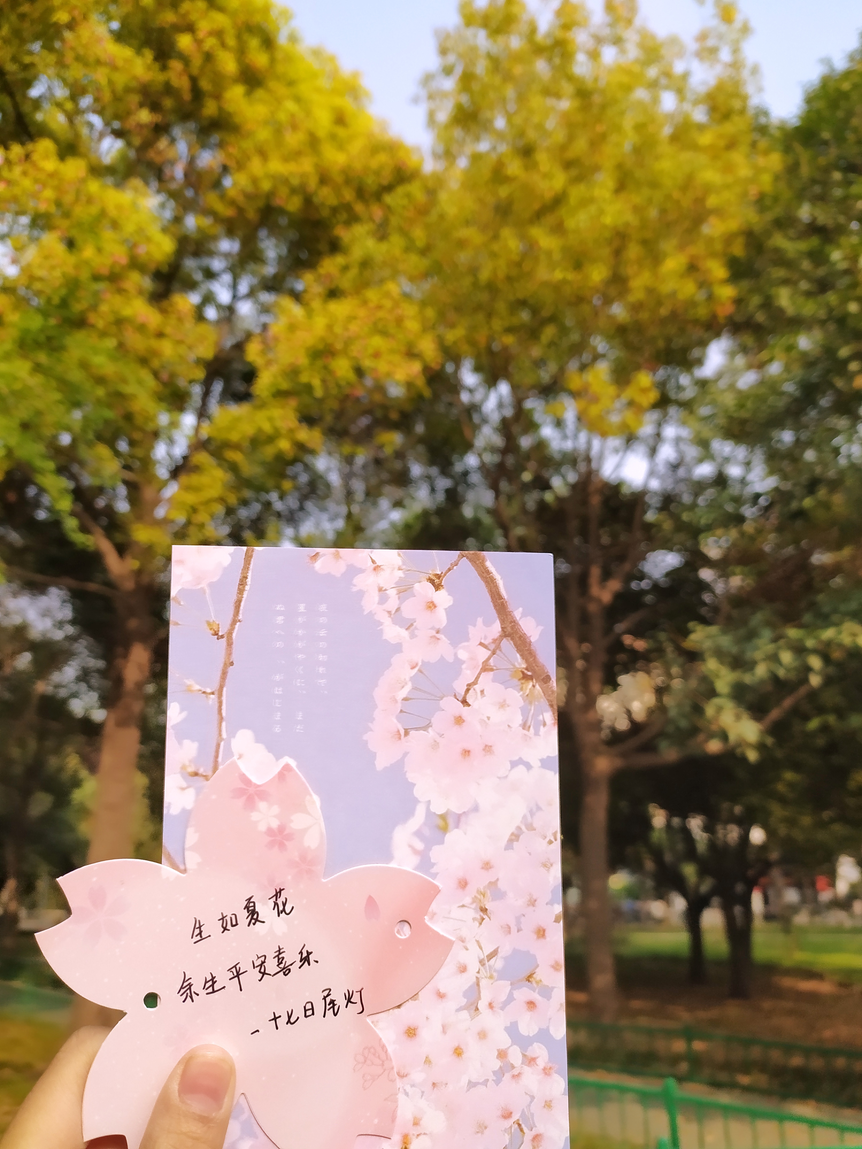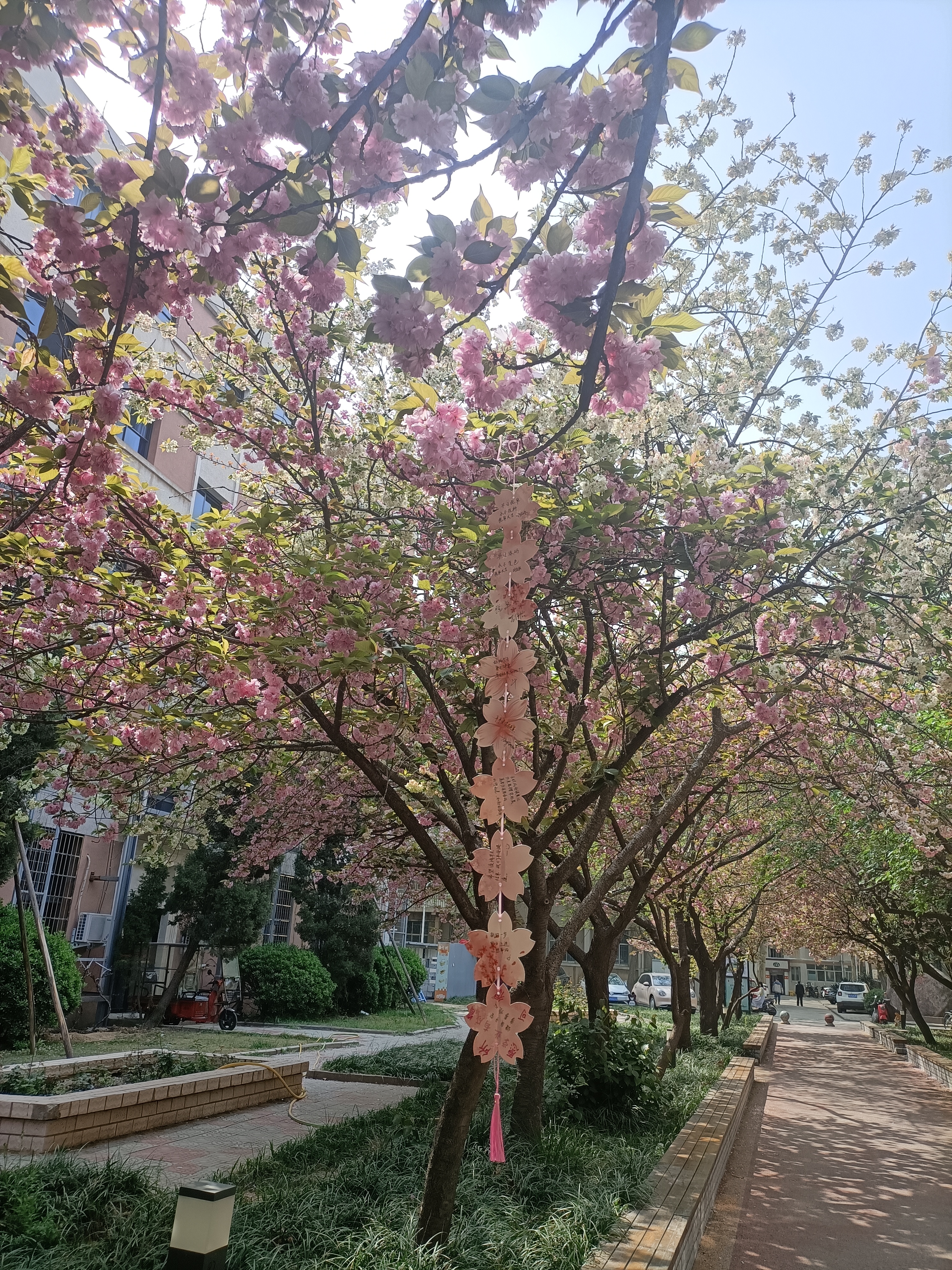 樱花小道旁,同学们把贺卡与樱花相结合,他们或将花粘在贺卡上,添上画上几笔树干制成迷你版樱花树,或将自己赏樱后的所思所想融进作品中,一张张精致的贺卡便慢慢生成,大家将自己的心愿或对农大的祝福写在卡上,挂在花上,随风飘扬,与花共舞。