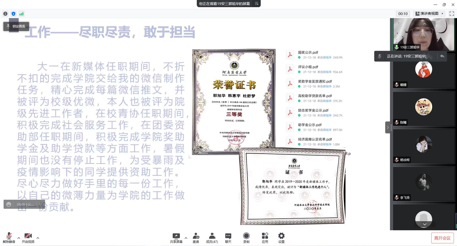 各位参选的个人与班级代表在有限的时间内,根据提前准备好的PPT对自身优势进行阐述。先进个人参选者们分别从学习、工作、荣誉、思想、社会实践等方面向大家分享了自己的经历。优异的成绩、卓著的荣誉、丰富的工作经验、向党靠拢的决心,无不表现出了他们独特的风采。班级代表们用班级的各项成就,以及班级同学们各项荣誉,为大家展现出了一个个井然有序,团结向上的集体。参选者与班级代表们面对演讲从容不迫、有条不紊,散发着自己的光芒,两个小时的会议,充分展现出了亚洲色吧
