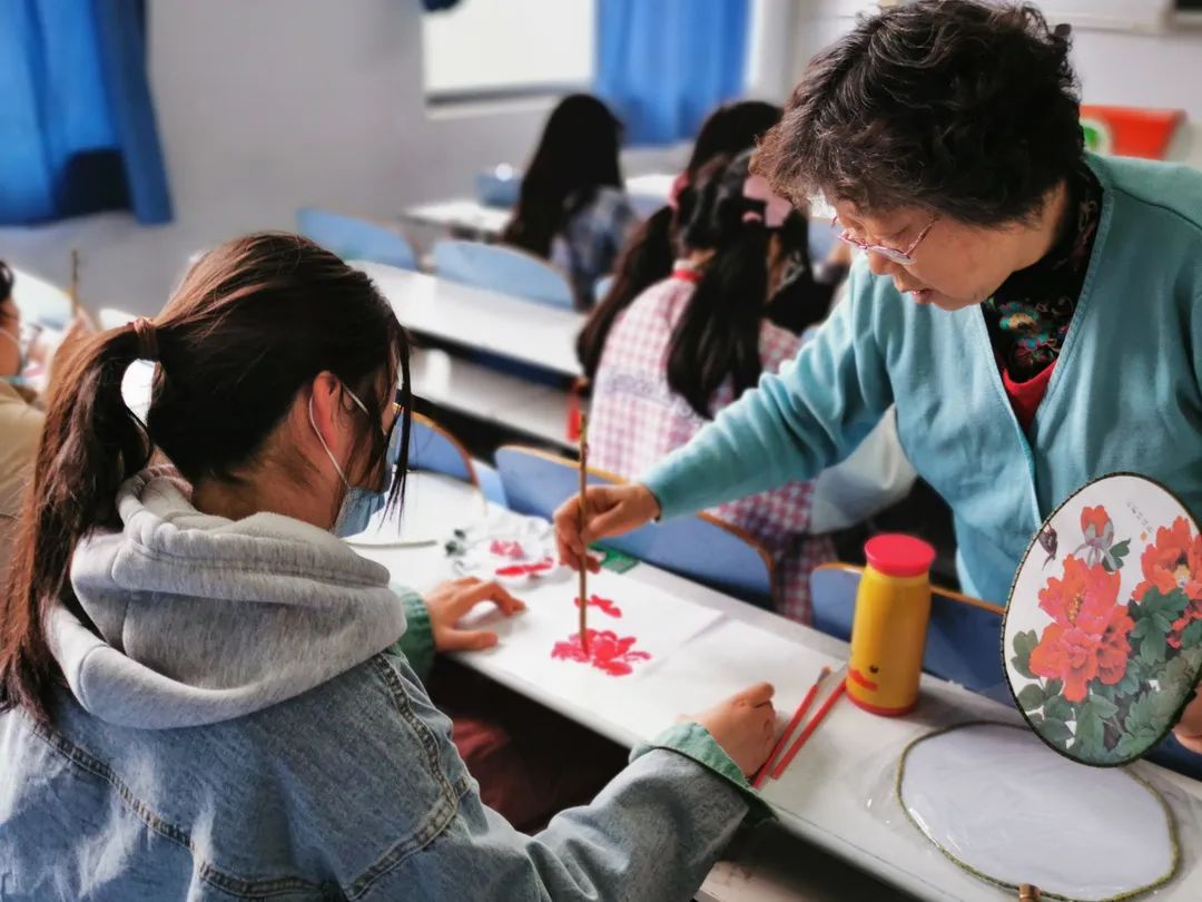 通过练习,同学们有了明显进步。纸张也换成了精致的扇面,随着画笔的落下,你瞧,扇面上樱花、牡丹争相绽放。你闻,空气中也酝酿出了春日的芬芳。