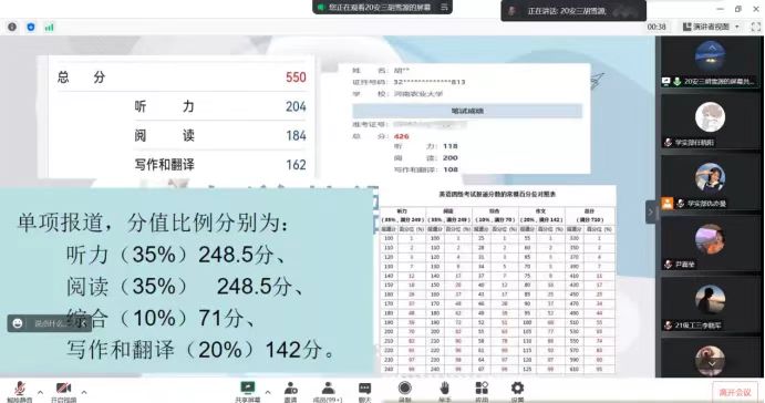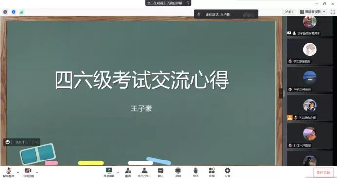 活动通过腾讯会议的方式在线上举行,胡雪源就自身四级备考经历与同学们分享相关备考经验,随后,由王子豪分享了自身的六级备考经验。同学们认真听讲、积极互动,并纷纷表示,通过此次分享会了解到了四六级备考经验,学习了有关四六级备考的知识,在接下来的时间里,会认真努力学习,积极备战四六级考试。