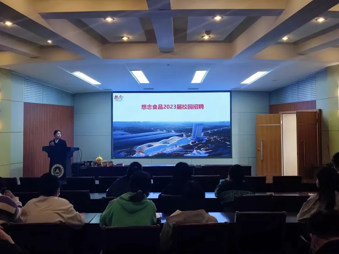 想念食品股份有限公司宣讲人通过播放《想念不如见面》微电影和校招宣传片向毕业生们展示了公司文化与发展历程。她从岗位职责、专业要求、岗位要求以及薪资待遇四个方面着重讲述了招聘信息,并阐述了“想念是谁”和公司的农业全产业链模式。