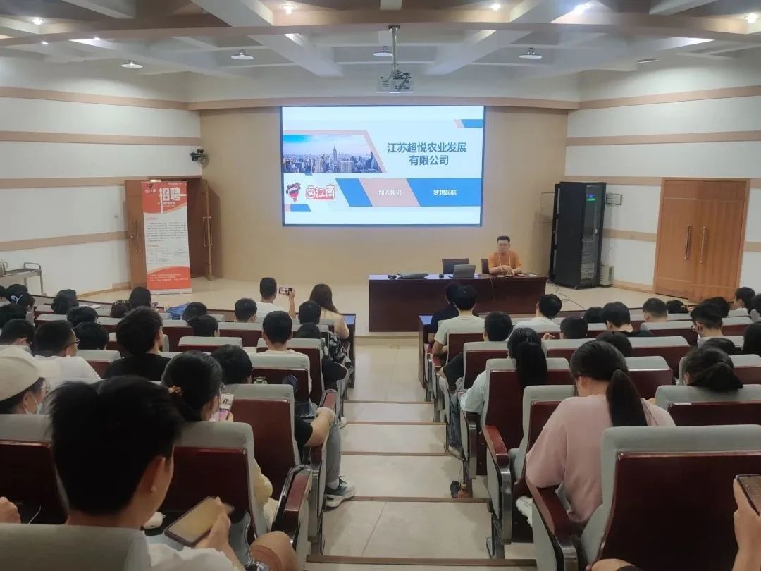 于文化路校区三百人报告厅召开江苏超悦农业发展有限公司招聘宣讲会暨生产实习培训会,院党委组织员陈翔、食工系副主任徐超、企业综合管理部负责人温彦涛、人事主管赵如琴、人事专员单胜飞出席会议,2020级部分学生参加。
