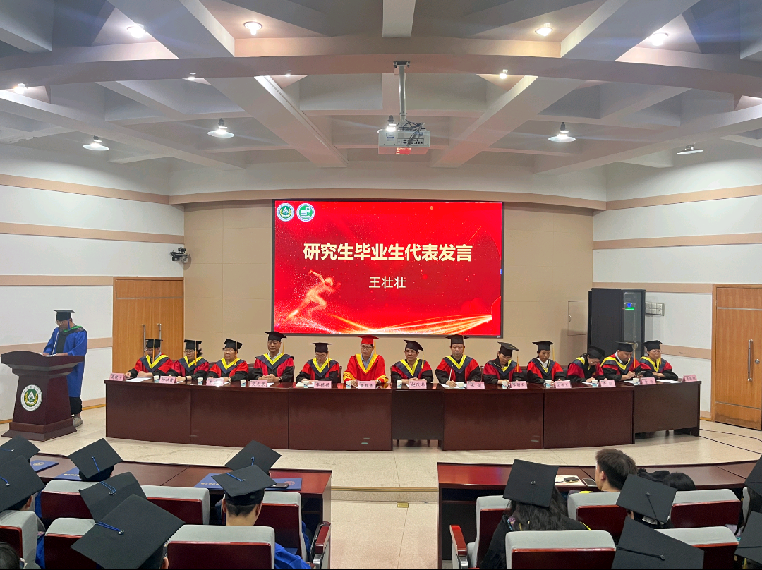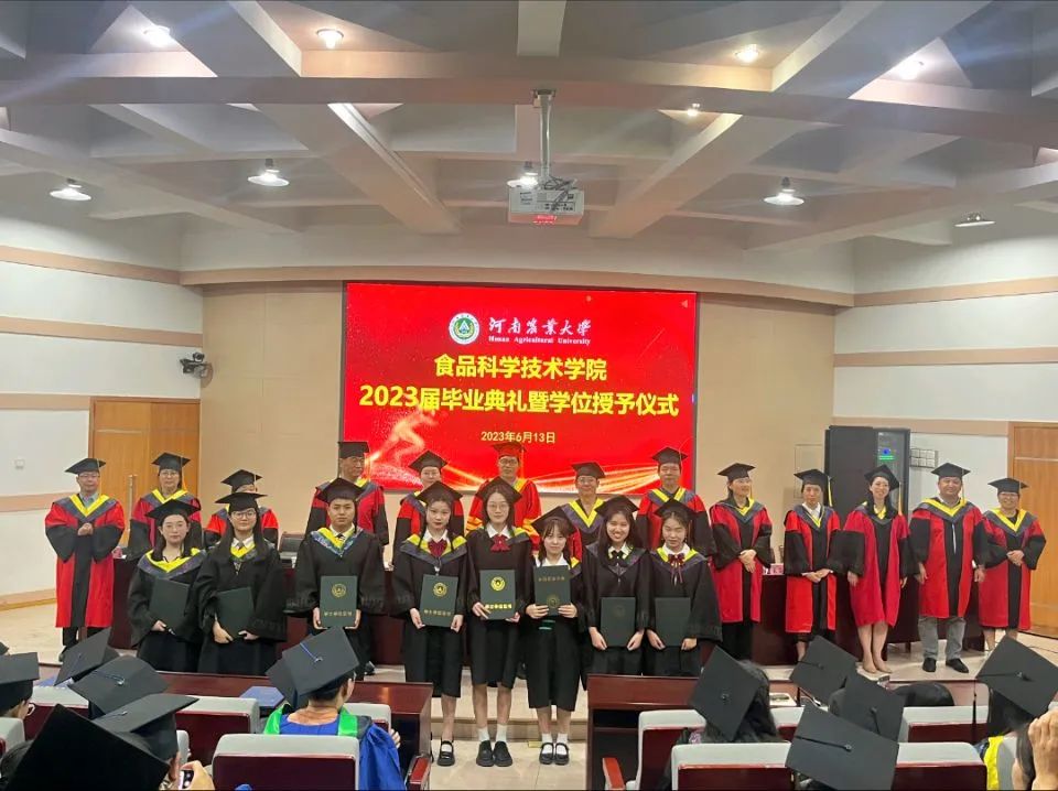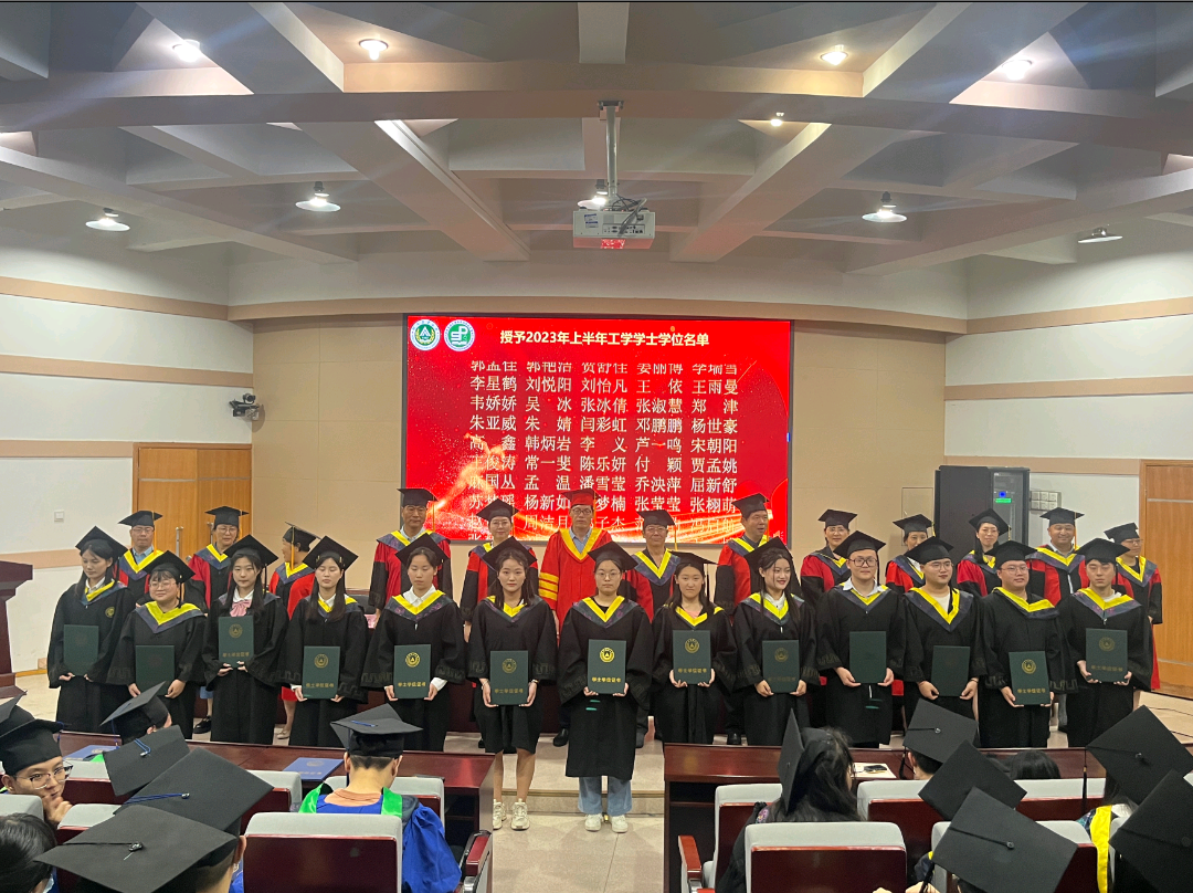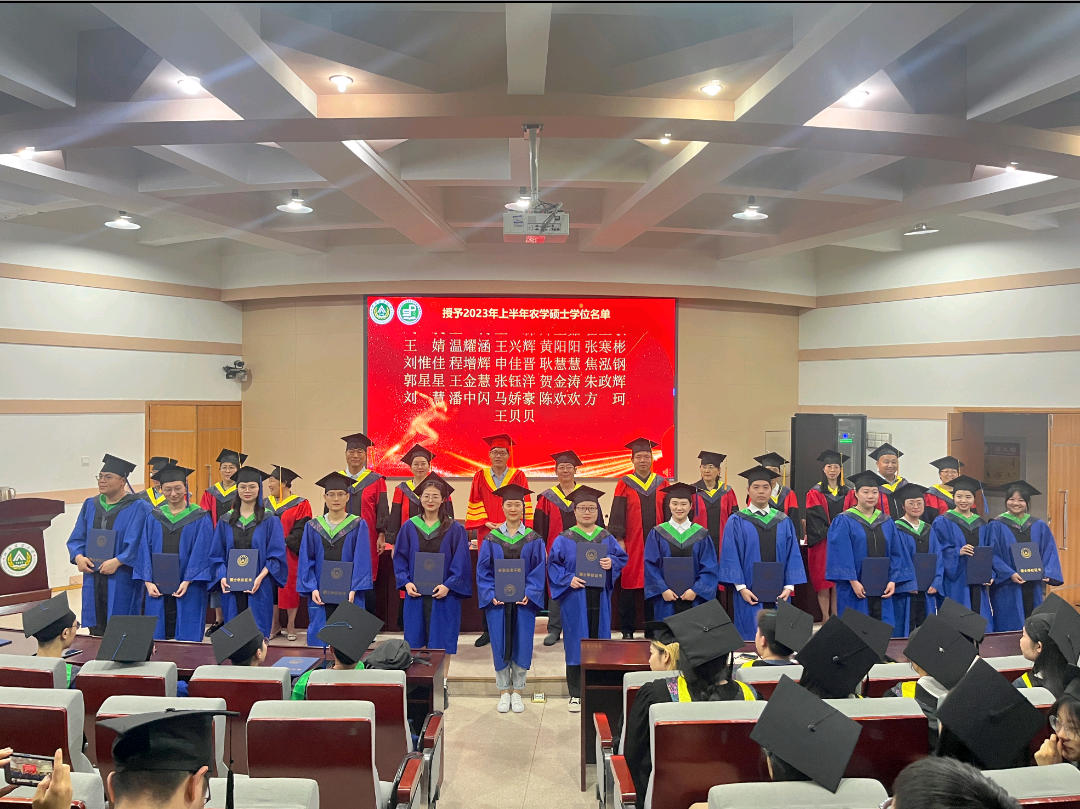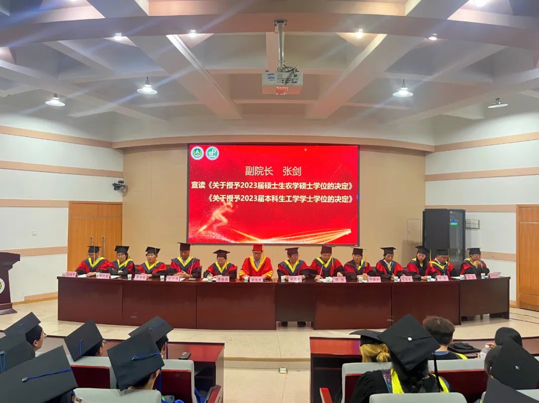 关于表彰2023届优秀毕业生的决定》《关于授予2023届硕士生农学硕士学位的决定》《关于授予2023届本科生工学学士学位的决定》,向2023届毕业生颁发学位证书,各位毕业生依次有序上台,由学术委员会的老师为各位学生拨穗,学生与老师合影留念,喜悦之情洋溢于言表。