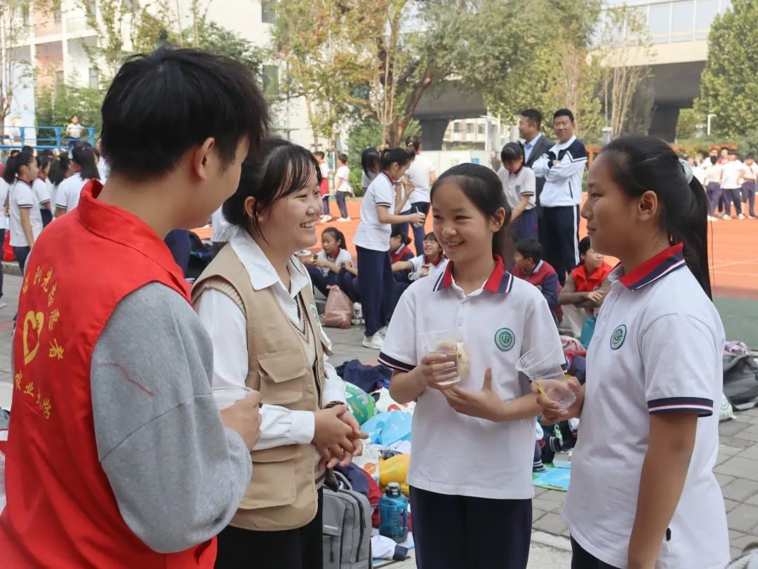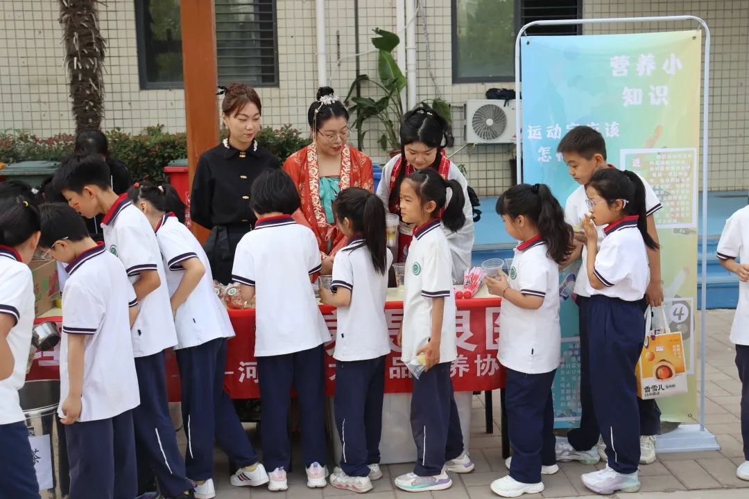 活动共分为五个区域 ,在休息区我校为附小附中的学生提供冰糖雪梨温开水,帮助他们进行运动后水分与营养的补充,同学们遵守规则,自觉排队。