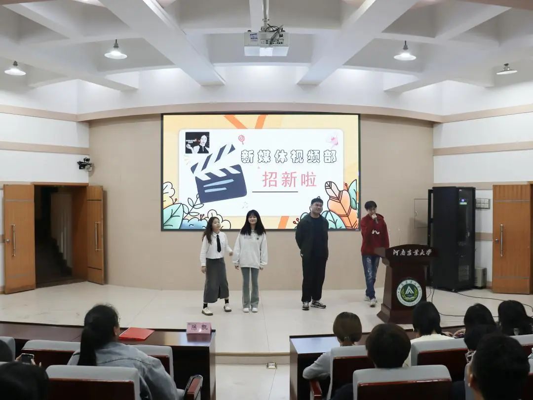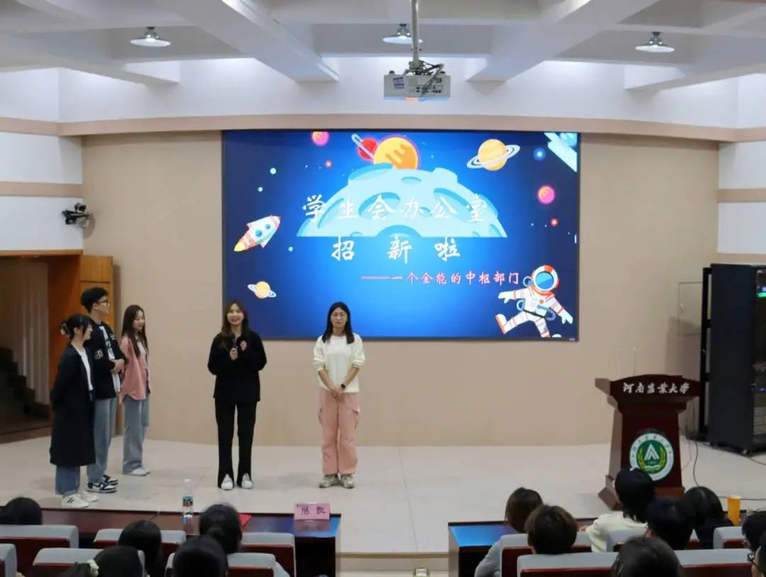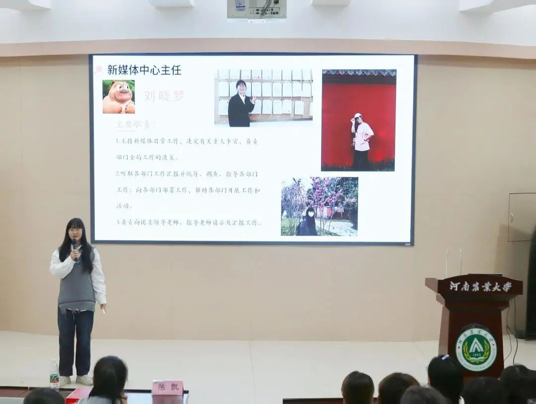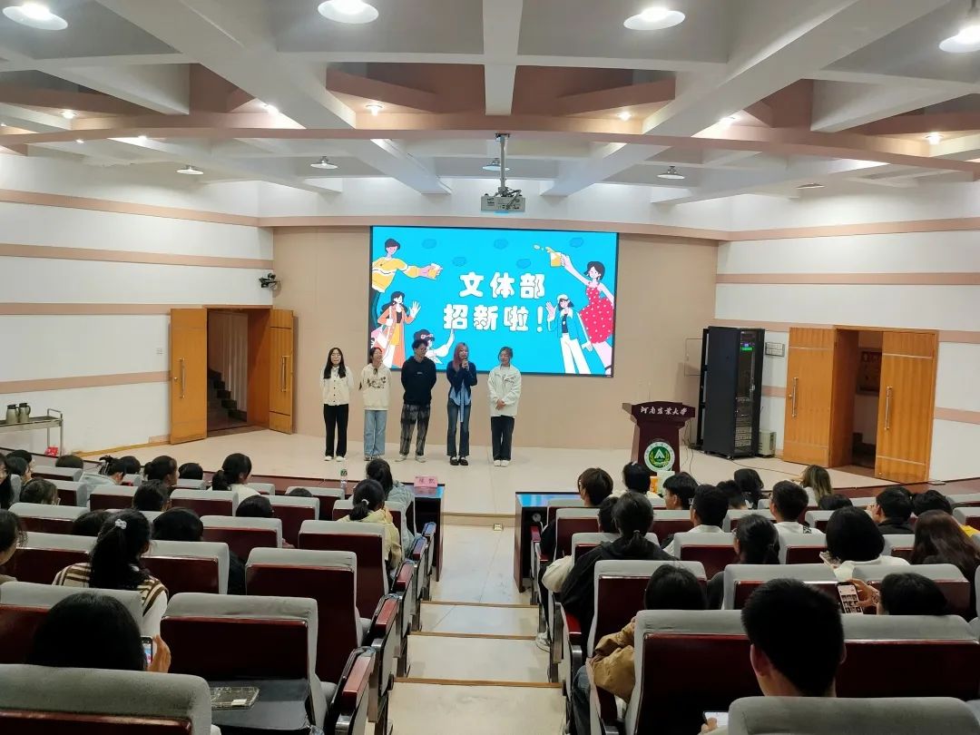 四大组织的负责人简单概述了各个组织的基本情况,随后,各部门成员依次上台,通过ppt和视频向同学们详细介绍了部门成员、部门工作以及能力要求。为增加趣味性,部门还设置了才艺展示、有奖趣味问答等环节,现场同学热情高涨,积极参与互动。