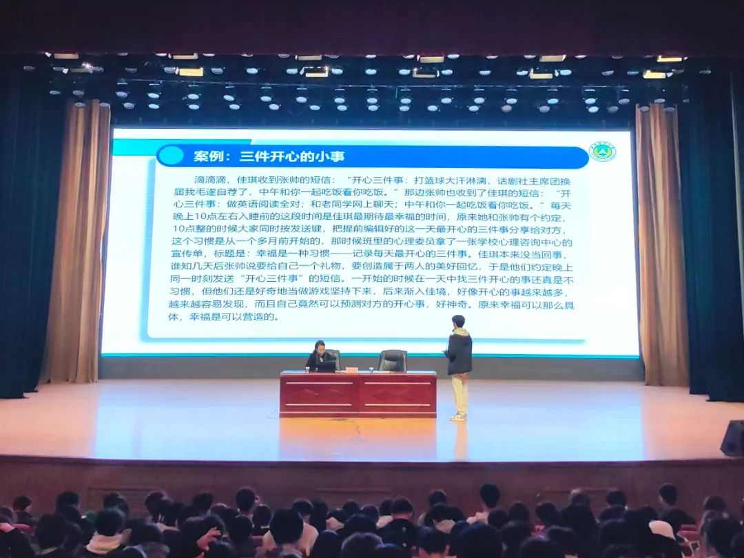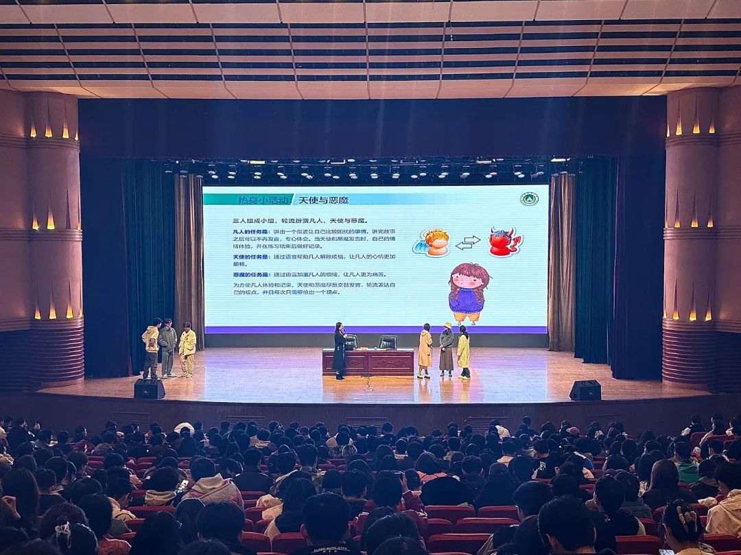 会议伊始,董方白通过热身游戏“抓手指”调动现场气氛,她通过国民心理健康报告引出当代大学生存在的心理问题。她强调,在当代大学生出现的心理问题中,抑郁心理和睡眠不足两项占据高位,借此,她向同学们深入讲解了不同心理疾病的成因以及拥有良好心理环境的重要性,她建议同学们应当及时进行自我排解,调整作息,养成良好的睡眠习惯。此外,她通过让同学们进行小游戏的方式,用真实生动的案例向同学们讲述了理性情储疗法。她指出,幸福感是可以被创造的,希望同学们在日常生活中可以通过记录三件开心的小事来创造幸福感,培养更加健康的心灵。